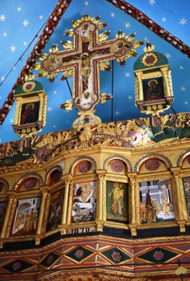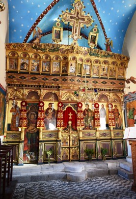 Όσον αφορά στον υφιστάμενο ναό, ιδιαίτερο ενδιαφέρον παρουσιάζει το ξυλόγλυπτο επιχρυσωμένο τέμπλο του, φιλοτεχνημένο στα 1870, το κτιστό προσκυνητάρι επί του νότιου τοίχου που φιλοξενεί την εικόνα του Αγίου Ιωάννη του Θεολόγου, φιλοτεχνημένη το 1870 από τον Μιχαήλ Συμαίο και το περίτεχνο, επιχρυσωμένο και επιζωγραφισμένο προσκυνητάρι στο οποίο εκτίθεται η εικόνα της Βρεφοκρατούσας Παναγίας της Αρταμίτισσας. Αμφότερες οι εικόνες  φέρουν ανηρτημένα μπροστά τους πληθώρα ταμάτων ως δημόσια μαρτυρία υποσχέσεων ή ευγνωμοσύνης των πιστών για την εκπλήρωση των ευχών τους.