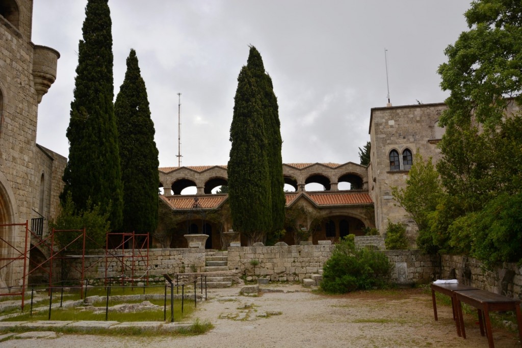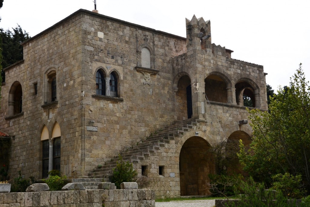 Το μοναστήρι των ιπποτικών χρόνων που καταλαμβάνει μεγάλο τμήμα του πλατώματος στην κορυφή του λόφου έχει ως πυρήνα μικρό ναό αφιερωμένο στην Παναγία στον οποίο αναγνωρίζονται τρεις οικοδομικές φάσεις. Η πρώτη ανάγεται στο α΄ μισό του 14ου αι. και αφορά στην ανέγερση ενός μονόχωρου σταυροθολιακού κτίσματος οικοδομημένου στο ανατολικό τμήμα του βόρειου κλίτους της βασιλικής. Στην επόμενη φάση που τοποθετείται γύρω στο 1450-1480, εντάσσεται η προσθήκη δύο εξάπλευρων παρεκκλησίων σε επαφή με την κόγχη του αρχικού ναού, ενώ στην τελευταία, επί μαγιστρείας Pierre d’ Aubusson (1423 – 1503), η προσθήκη δύο ακόμη παρεκκλησίων ανατολικά των προηγούμενων και σε επαφή μαζί τους.