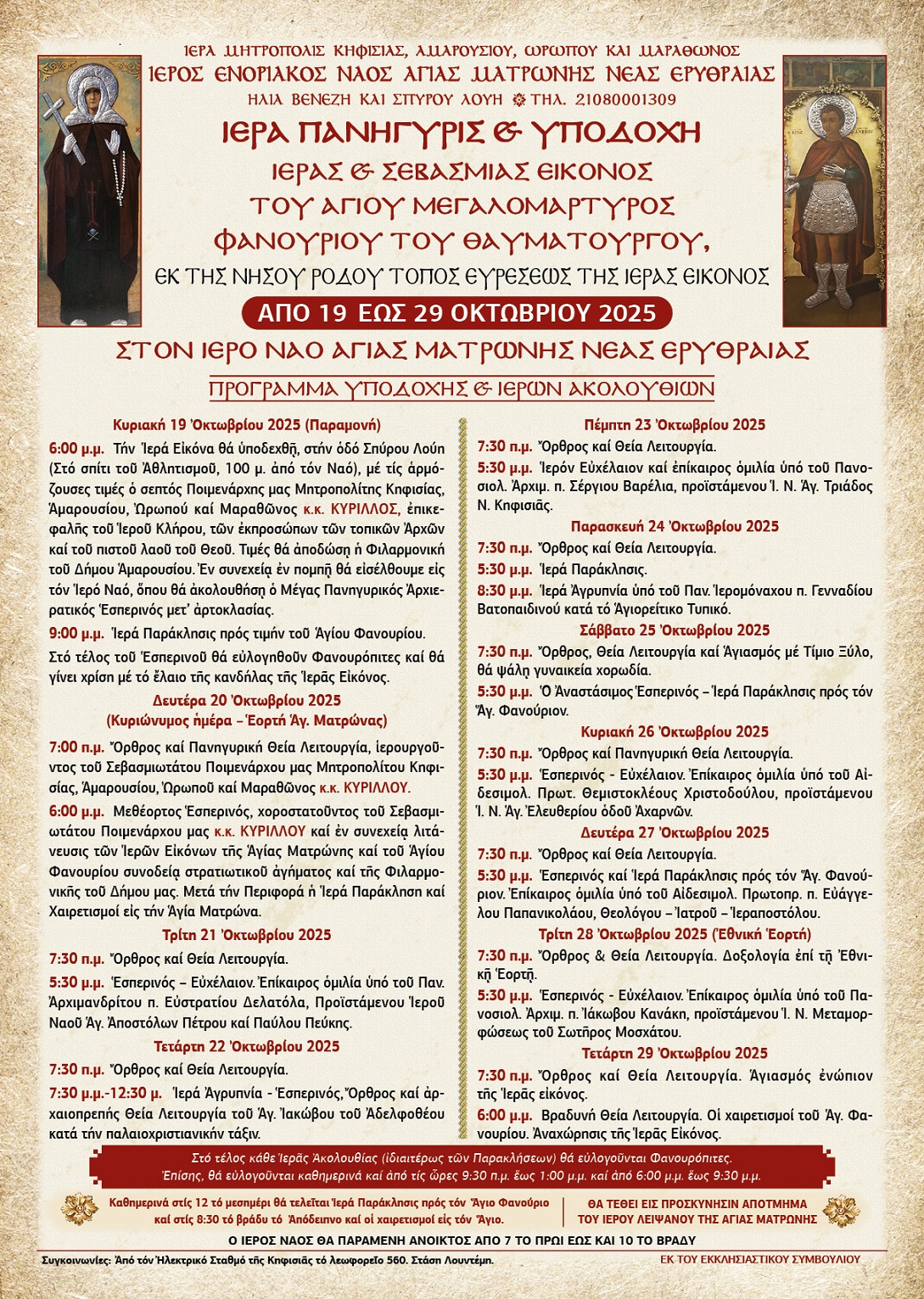 Ιερά Πανήγυρις και Υποδοχή Ιεράς Εικόνος Αγ. Φανουρίου του Θαυματουργού στον Ι.Ν. Αγίας Ματρώνης Ν. Ερυθραίας ΕΛΛΑΔΑ, ΜΗΤΡΟΠΟΛΕΙΣ 12.10.2025 | 19:50