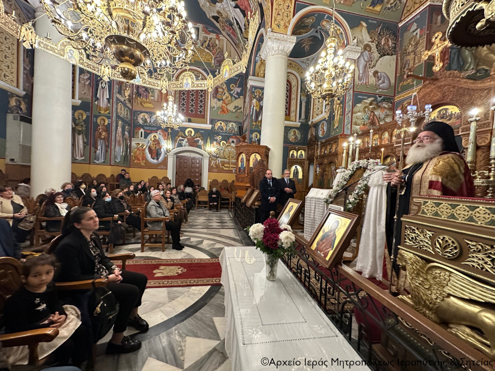 Στην ακολουθία χοροστάτησε και κήρυξε κατάλληλα τον θείο λόγο ο Σεβ. Μητροπολίτης Ιεραπύτνης και Σητείας κ. Κύριλλος, ο οποίος ανέγνωσε την πρώτη και την τέταρτη Στάση των Χαιρετισμών.