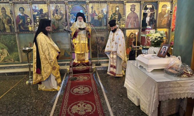 Την Κυριακή των Απόκρεω, 23 Φεβρουαρίου 2025, ο Σεβ. Μητροπολίτης Ιεραπύτνης και Σητείας κ. Κύριλλος χοροστάτησε στην ακολουθία του Όρθρου και στη συνέχεια ιερούργησε και κήρυξε επίκαιρα τον θείο λόγο στον Ιερό Ενοριακό Ναό Ζωοδόχου Πηγής στην Τοπική Κοινότητα Επάνω Χωριού Ιεράπετρας. Πριν την Απόλυση της Αρχιερατικής Θείας Λειτουργίας τέλεσε το τεσσαρακονθήμερο ιερό μνημόσυνο υπέρ αναπαύσεως της μακαριστής Άννας Μαυρικάκη-Φεργαδάκη.