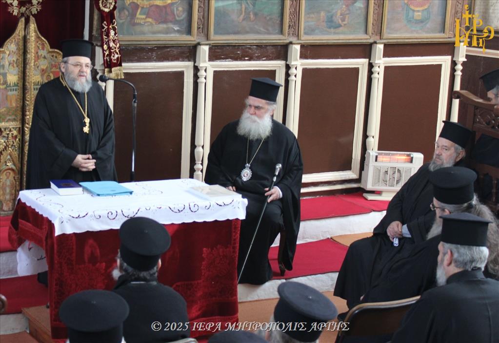 Ο Σεβασμιώτατος Μητροπολίτης Άρτης κ. Καλλίνικος παρουσίασε τον ομιλητή στους Κληρικούς και αφού ευχαρίστησε τον Μακαριώτατο Αρχιεπίσκοπο Αθηνών και πάσης Ελλάδος κ. Ιερώνυμο για την ευλογία, να απουσιάσει ο π. Δαμασκηνός από τα Συνοδικά του καθήκοντα, εξέφρασε την ευγνωμοσύνη του στον π. Δαμασκηνό, για την παρουσία του στην Ιερά Μητρόπολη Άρτης.