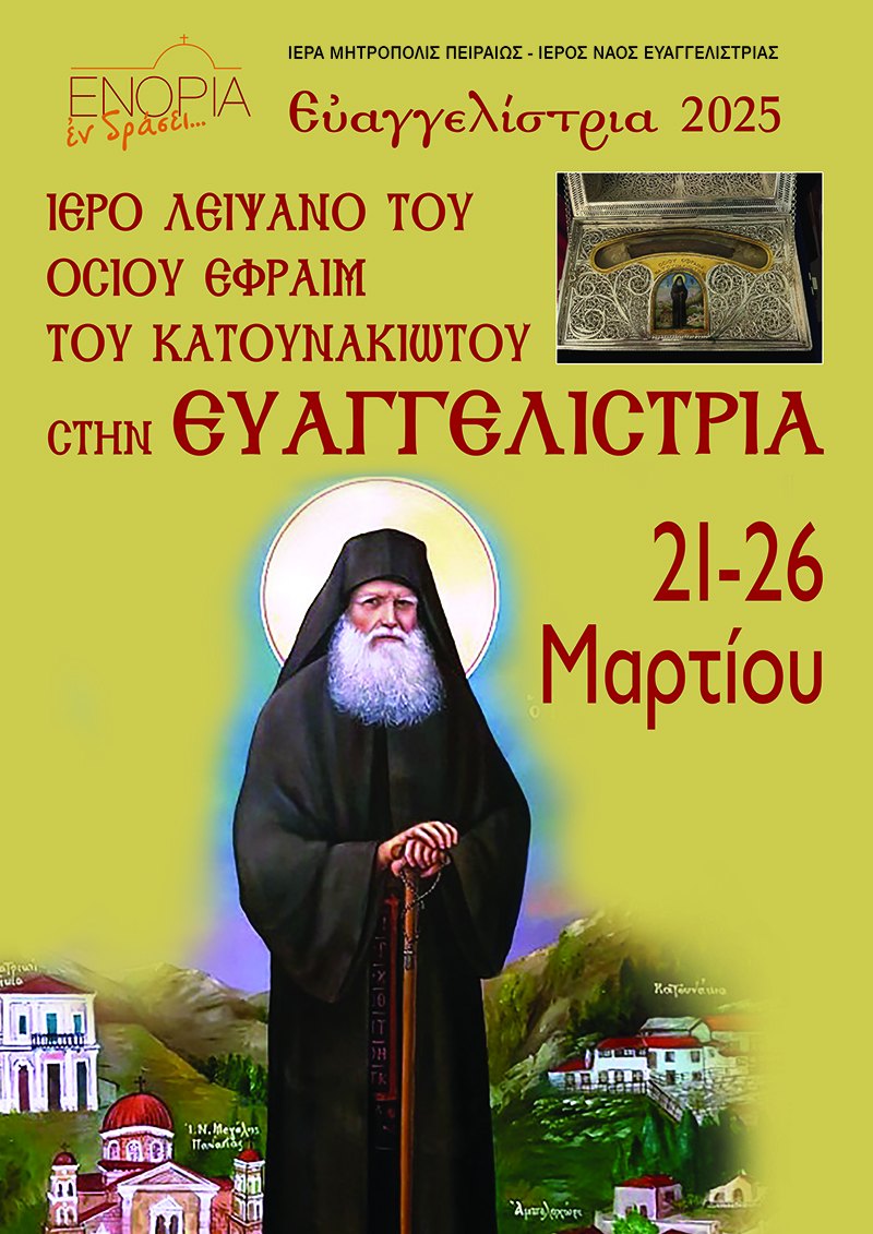 Ένα σπουδαίο εκκλησιαστικό γεγονός και μία ιδιαίτερη ευλογία θα αποτελέσει για τον Πειραιά και για τον Ιερό Ναό Ευαγγελιστρίας Πειραιώς, η μεταφορά Ιερού Λειψάνου του Οσίου Εφραίμ του Κατουνακιώτου που φυλάσσεται στην Ιερά Μονή Μεταμορφώσεως Σαγματά, κατά την διάρκεια των εορταστικών εκδηλώσεων «Ευαγγελίστρια 2025».