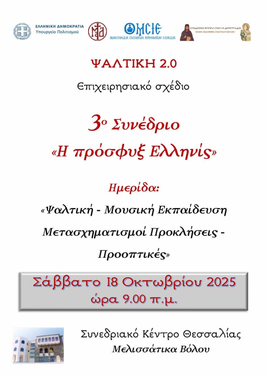 Το Σάββατο 18 Οκτωβρίου, στο πλαίσιο του 3ου Συνεδρίου «Ψαλτική 2.0», θα πραγματοποιηθεί Ημερίδα με θέμα «Ψαλτική Μουσική Εκπαίδευση: Μετασχηματισμοί, Προκλήσεις, Προοπτικές», μια εκδήλωση εξαιρετικού ενδιαφέροντος για τον χώρο της Ψαλτικής Τέχνης και Εκπαίδευσης.