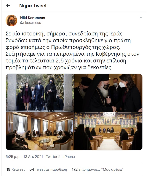 “Σε μία ιστορική, σήμερα (σ.σ. χθες), συνεδρίαση της Ιεράς Συνόδου κατά την οποία προσκλήθηκε για πρώτη φορά επισήμως ο Πρωθυπουργός της χώρας. Συζητήσαμε για τα πεπραγμένα της Κυβέρνησης στον τομέα τα τελευταία 2,5 χρόνια και στην επίλυση προβλημάτων που χρόνιζαν για δεκαετίες. Ο Πρωθυπουργός Kyriakos Mitsotakis ευχαρίστησε τη Διαρκή Ιερά Σύνοδο για την εξαιρετική συνεργασία και ζήτησε την καίρια συνδρομή της Εκκλησίας στα μέτρα προστασίας και πρόληψης κατά του κορωνοϊού και ιδιαιτέρως στην προσπάθεια για τον καθολικό εμβολιασμό. Ευχαρίστησα ιδιαιτέρως την Διαρκή Ιερά Σύνοδο για την εξαιρετική τιμή να είμαι η πρώτη γυναίκα που συμμετείχε σε συνεδρίασή της στην ιστορία της”, έγραψε.