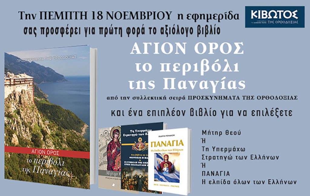 Την Πέμπτη 18 Nοεμβρίου η εφημερίδα Κιβωτός της Ορθοδοξίας σας προσφέρει για πρώτη φορά το συλλεκτικό βιβλίο ΑΓΙΟΝ ΟΡΟΣ, Το περιβόλι της Παναγίας, από την μοναδική συλλογή ΠΡΟΣΚΥΝΗΜΑΤΑ ΤΗΣ ΟΡΘΟΔΟΞΙΑΣ