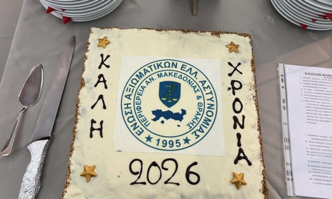 Το μεσημέρι της Κυριακης 11 Ιανουαρίου 2026 πραγματοποιήθηκε η κοπή της βασιλόπιτας της Ένωσης Αξιωματικών Ελληνικής Αστυνομίας Ανατολικής Μακεδονίας και Θράκης, με τη συμμετοχή εκπροσώπων της πολιτείας, της τοπικής αυτοδιοίκησης και της ηγεσίας του Σώματος.