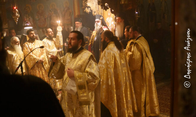 Στον Πολυαρχιερατικό Εσπερινό χοροστάτησε ο Σεβασμιώτατος Μητροπολίτης Κορίνθου, Σικυώνος, Ζεμενού, Ταρσού και Πολυφέγγους κ. Παύλος, συγχοροστατούτων των Σεβασμιωτάτων Μητροπολιτών, Λαρίσης και Τυρνάβου κ. Ιερωνύμου και Φθιώτιδος κ. Συμεών.