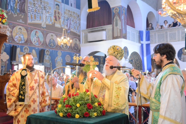 Στον κατάμεστο ναό Εσταυρωμένου Ταύρου προεξήρχε της Θείας Λειτουργίας για την εορτή της Υψώσεως του Τιμίου Σταυρού, ο μητροπολίτης Κορωνείας κ. Παντελεήμων,πλαισιωμένος απο τους ιερείς του ναού.