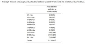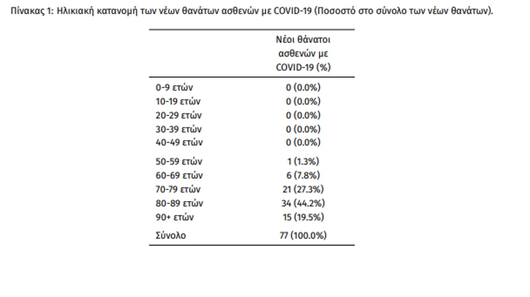 Οι νέοι θάνατοι ασθενών με COVID-19 είναι 77, ενώ από την έναρξη της επιδημίας έχουν καταγραφεί συνολικά 25.260 θάνατοι. Το 95.0% είχε υποκείμενο νόσημα ή/και ηλικία 70 ετών και άνω.