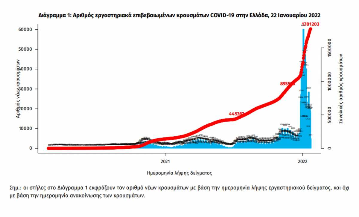 Ο κορονοϊός εξακολουθεί να εξαπλώνεται σε όλη τη χώρα, όπως φαίνεται κι από τα σημερινά (Σάββατο 22.01.2022) επιδημιολογικά δεδομένα που ανακοίνωσε ο ΕΟΔΥ.