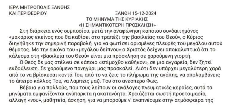 Ξάνθης Παντελεήμων: Η σημαντικότερη πρόσκληση Δόγμα 15 Ιανουαρίου 2025 21:40 Tags: ΜΗΤΡΟΠΟΛΙΤΗΣ ΞΑΝΘΗΣ ΠΑΝΤΕΛΕΗΜΩΝ