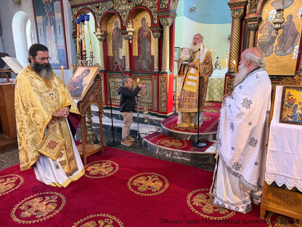 Στην Αρχιερατική θεία Λειτουργία έλαβαν μέρος ο Πανοσιολ. Αρχιμ. Αμβρόσιος Σκαρβέλης, Πρωτοσύγκελλος της Ι. Μητροπόλεως, ο Αιδεσιμολ. Οικονόμος Θεολόγος Καλαφατάκης, Εφημέριος της Ενορίας Καλού Χωριού, και ο Διάκονος Θεμιστοκλής Μπεϊνάς.