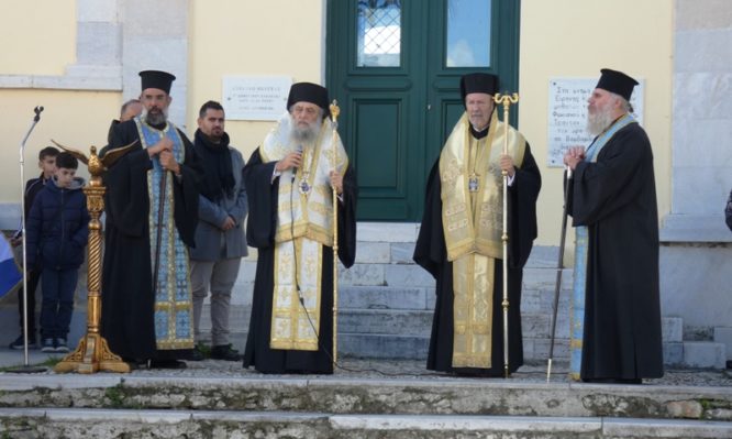 Ακολούθως ο Σεβασμιώτατος μετέβη στο Α΄ Δημοτικό Σχολείο Παροικίας (παραπλεύρως του Ιερού Προσκυνήματος της Εκατονταπυλιανής) όπου μπροστά από την είσοδο του σχολείου, τέλεσε μαζί με τον Θεοφιλέστατο Επίσκοπο Κεράμων κ. Βαρθολομαίο, Επιμνημόσυνη Δέηση υπέρ Αναπαύσεως των ψυχών της Δασκάλας Ειρήνης Κονδύλη και των δύο μαθητών Αθανασίου Φωκιανού και Φραγκίσκας Τσαντάνη, οι οποίοι πριν 80 χρόνια έχασαν την ζωή τους, όταν συμμαχικά αεροπλάνα βομβάρδισαν το κελί του Ιερού Προσκυνήματος της Παναγίας μας της Εκατονταπυλιανής, το οποίο φιλοξενούσε μία τάξη του Δημοτικού Σχολείου Παροικίας. Μετά το Τρισάγιο πραγματοποιήθηκε ομιλία από την Φιλόλογο και Πρόεδρο του Δημοτικού Συμβουλίου του Δήμου Πάρου κ. Ιφιγένεια Χατζηγεωργίου.