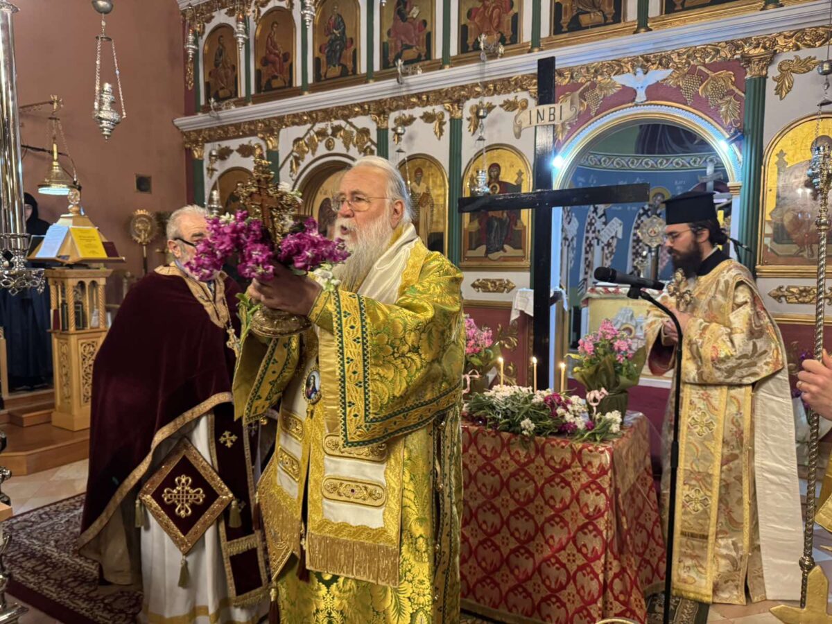 Ο κ. Νεκτάριος, μιλώντας στους πιστούς πριν την τελετή της Σταυροπροσκυνήσεως, αφορμήθηκε από το αποστολικό ανάγνωσμα της ημέρας από την προς Εβραίους επιστολή του Αποστόλου Παύλου. Ο κ. Νεκτάριος τόνισε ότι στην παράδοση της Παλαιάς Διαθήκης οι αρχιερείς των Ιουδαίων θυσίαζαν ζώα για να εξιλεωθούν οι συμπατριώτες τους από τις αμαρτίες τους έναντι του Θεού. Αυτός ο εξιλασμός όμως δεν απάλλασσε τους ανθρώπους από την οδύνη του θανάτου, ούτε έδινε λύτρωση στη ζωή, αλλά μία πρόσκαιρη παρηγορία. Η ενανθρώπηση όμως του Υιού και Λόγου του Θεού, του Κυρίου ημών Ιησού Χριστού, του Αρχιερέως όχι κατά την τάξη του Ααρών, αλλά και την τάξη Μελχισεδέκ, ο οποίος ήταν «απάτωρ, αμήτωρ και αγενεαλόγητος», αλλάζει τον κόσμο. Και ο Χριστός είναι απάτωρ εκ μητρός και αμήτωρ εκ Πατρός. Ανήκε στη γενιά του Δαβίδ, αλλά την ίδια στιγμή ήρθε να σώσει όλους τους ανθρώπους και όχι μόνο τους συμπατριώτες του. Και δεν προσφέρει τώρα ως θυσία το αίμα των ζώων, αλλά το δικό Του αίμα επάνω στον Σταυρό, για να ξεκινήσει με τον θάνατο και την ανάστασή Του η περίοδος της άφεσης, της καταλλαγής, της πορείας προς τη βασιλεία Του, που είναι η αγάπη και η αλήθεια. Η θυσία του Κυρίου συνετελέσθη άπαξ στον Σταυρό του Γολγοθά. Όμως το Σώμα Του και το Αίμα Του το κοινωνούμε σε κάθε θεία λειτουργία, λαμβάνοντας άφεση αμαρτιών και ζωή αιώνιο.