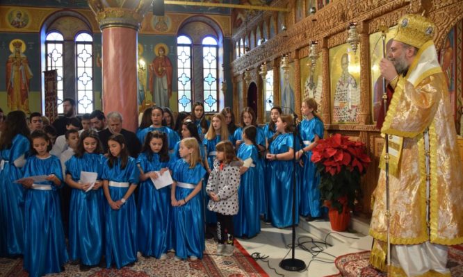 Μέτα το πέρας της Αρχιερατικής Θείας Λειτουργίας, ο Σεπτός μας Ποιμενάρχης, περιχαρής άκουσε από τα παιδιά, τους νέους και τις νέες της ενορίας, να τραγουδούν τα παραδοσιακά κάλαντα και επίκαιρους Χριστουγεννιάτικους Ύμνους, μεταφέροντας με τον με το δικό τους αγνό και παραδοσιακό τρόπο, το μεγάλο μήνυμα της Χαράς, της Ειρήνης, της Αγάπης και της Καταλαγής, που πηγάζει μέσα από το Σπήλαιο της Βηθλεέμ.