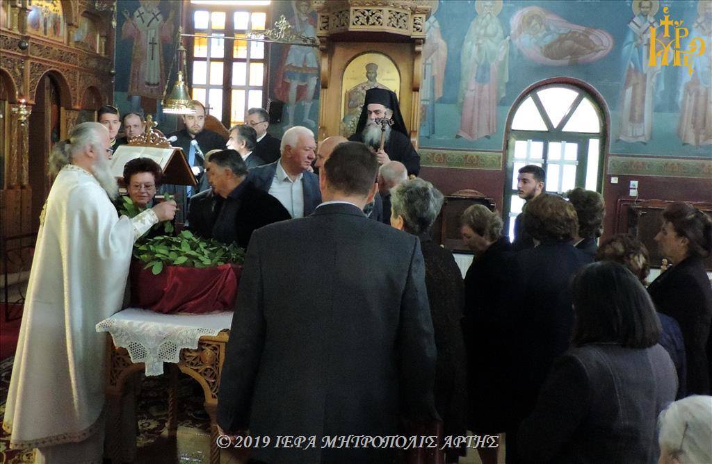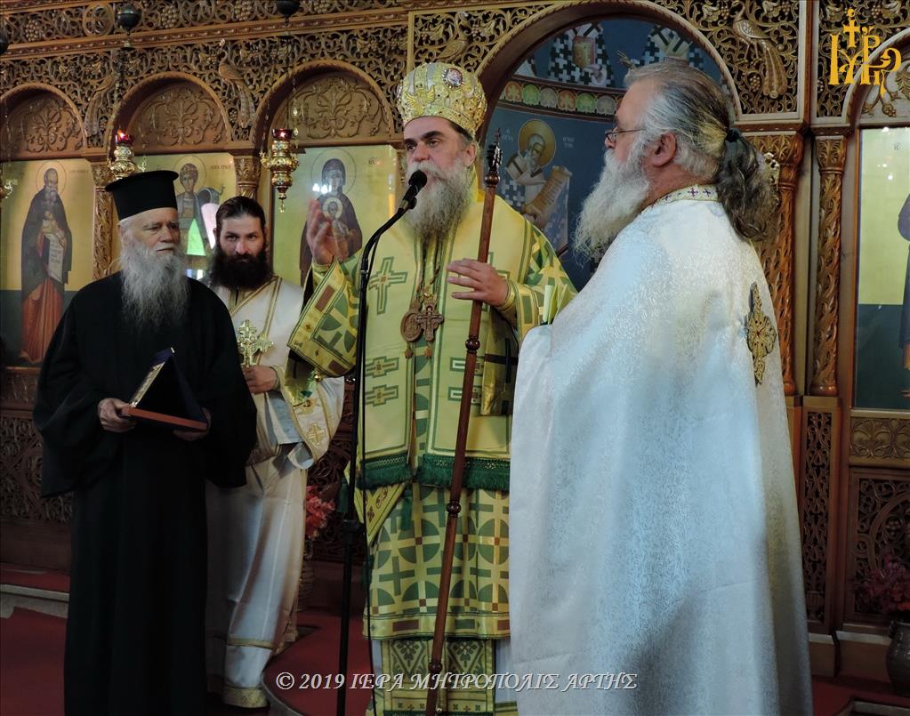 Μετά το πέρας της Θείας Λειτουργίας, ο εφημέριος του Ναού π. Παναγιώτης Τζουβάρας και το Εκκλησιαστικό Συμβούλιο της Ενορίας, δια χειρών του Σεβασμιωτάτου Μητροπολίτου Άρτης κ. Καλλινίκου, ευγνωμοσύνης ένεκεν, ετίμησε με πλακέτα τον προεφημέριο της Ενορίας π. Ελευθέριο Μπόβολο.