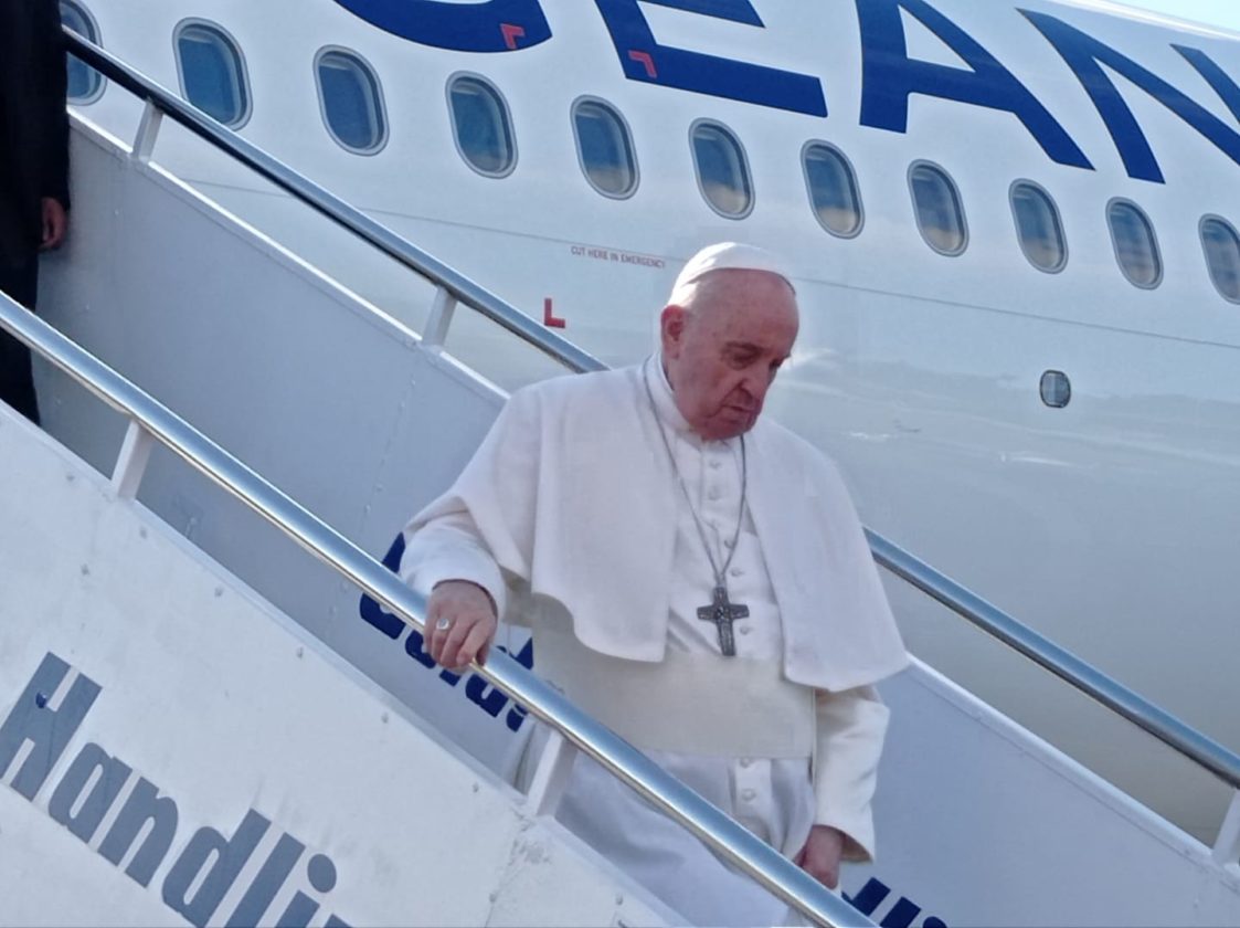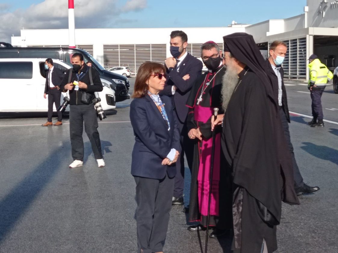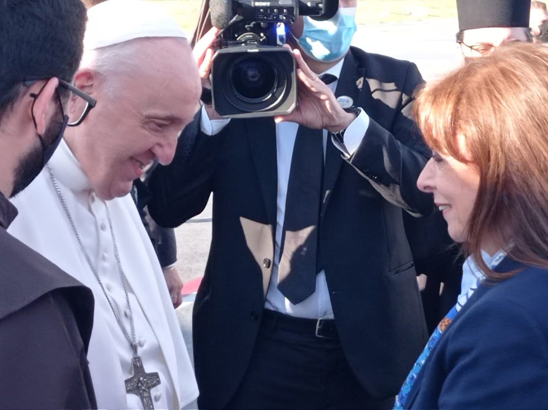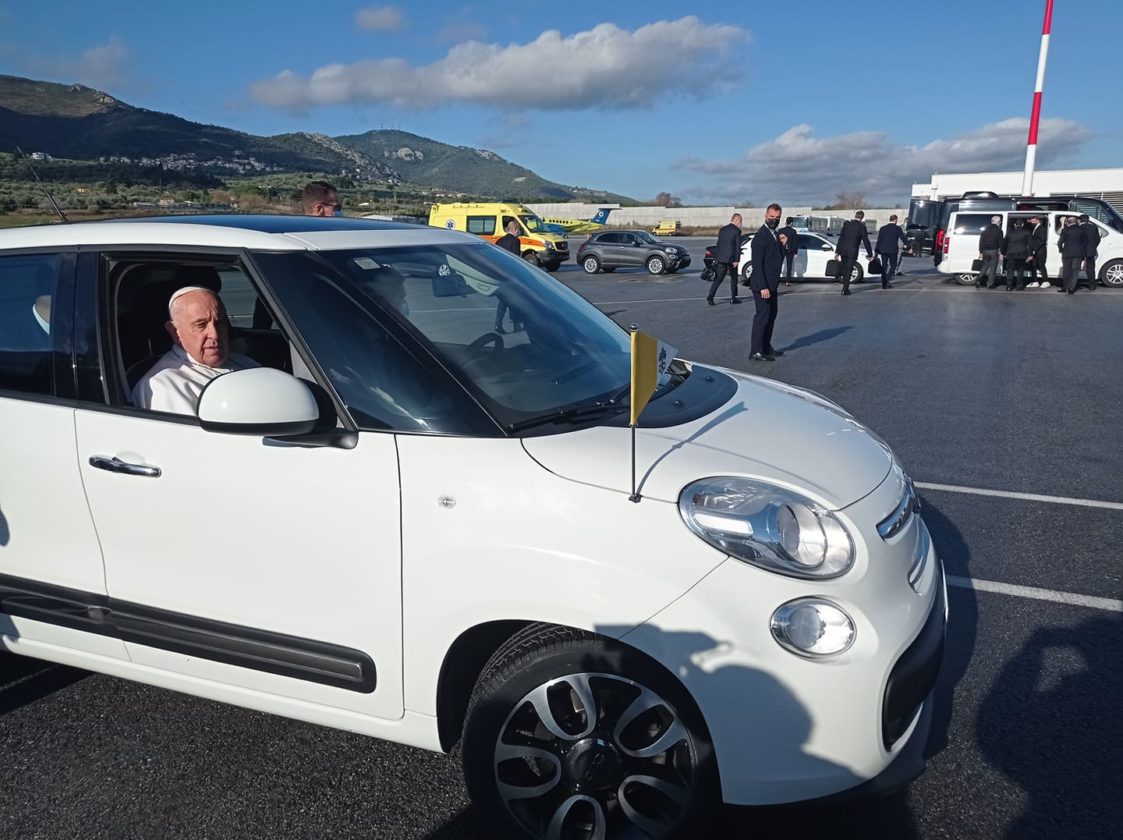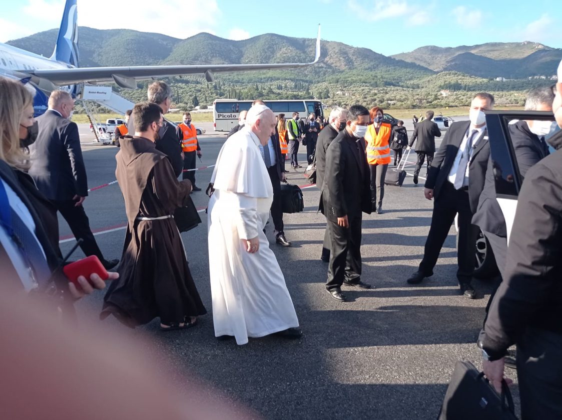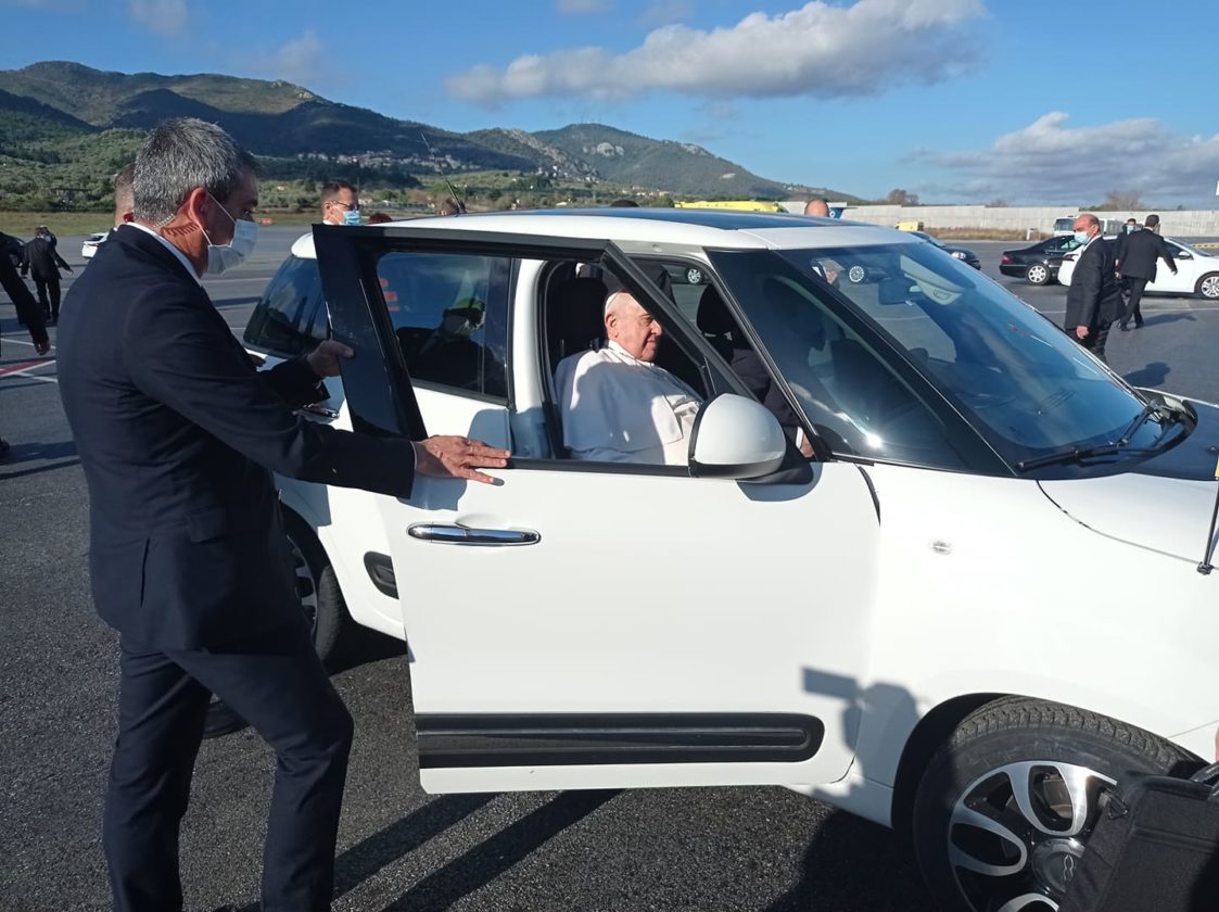Τον υποδέχτηκαν η πρόεδρος της Δημοκρατίας Κατερίνα Σακελλαροπούλου καθώς και ο Μητροπολίτης Μυτιλήνης, Ιάκωβος. O πάπας Φραγκίσκος μεταβαίνει στο ΚΥΤ Μαυροβουνίου με το αγαπημένο του αυτοκίνητο.