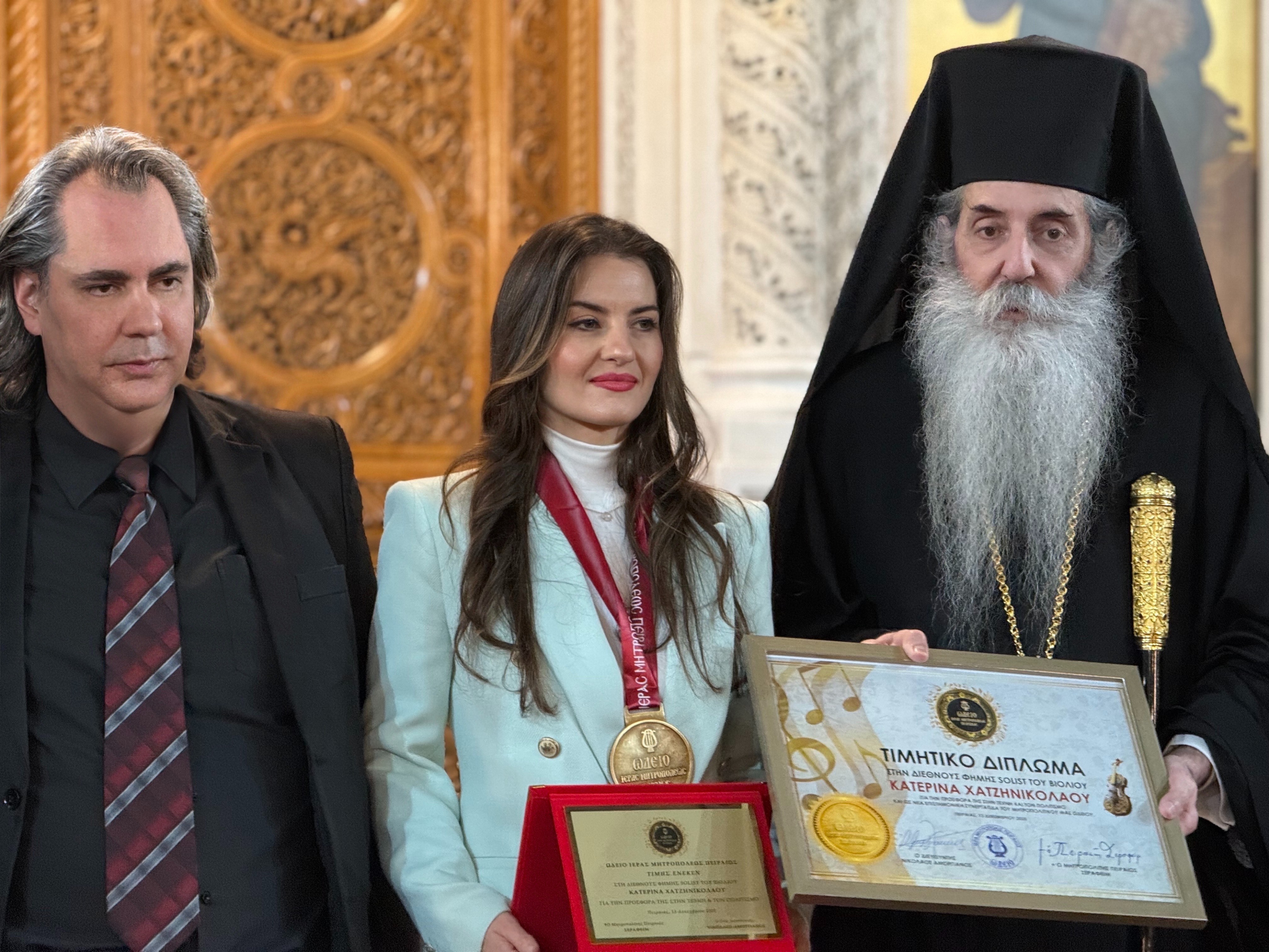 Μία ακόμα ξεχωριστή στιγμή ήταν αυτή της βράβευσης της διεθνούς φήμης solist του Βιολιού Κατερίνας Χατζηνικολάου, Προεξάρχουσας της Κρατικής Ορχήστρας Αθηνών και Επ.Καθηγήτριας του Ε.Κ.Π.Α. η οποία τιμήθηκε από τον Σεβασμιώτατο Μητροπολίτη Πειραιώς κ.κ.Σεραφείμ και τον Γενικό Διευθυντή του Μητροπολιτικού Ωδείου κ.Νίκο Αμοργιανό,για την προσφορά της στην Τέχνη και τον Πολιτισμό.