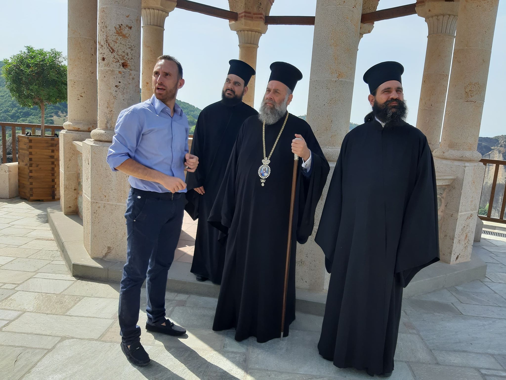 Με το πέρας της Θείας Λειτουργίας ο κ. Τιμόθεος ξεναγήθηκε στο σκευοφυλάκιο της Μονής όπου φυλάσσονται θησαυροί αιώνων, από τον υπεύθυνο αυτού Αλέξανδρο Σχορτσιανίτη.