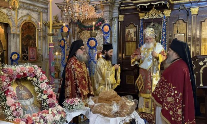 Ο κ. Θεόκλητος ευχήθηκε η Παναγία να χαρίζει υγεία, ομόνοια, πνεύμα ταπεινώσεως και μετανοίας, ώστε να ζούμε τη ζωή μας με χαμόγελο, με κουράγιο, με αισιοδοξία. Ζει Κύριος ο Θεός. Ο Χριστός νίκησε τον θάνατο και μας χάρισε τη ζωή και γι’ αυτό οφείλουμε με αυτό το ήθος να πορευόμαστε.