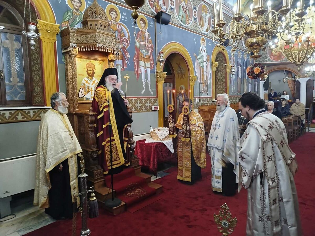 πανηγυρικής Θείας Λειτουργίας στον ενοριακό Ιερό Ναό Αγίας Αικατερίνης Τρίπολης, πλαισιούμενος από πλειάδα Ιερέων.