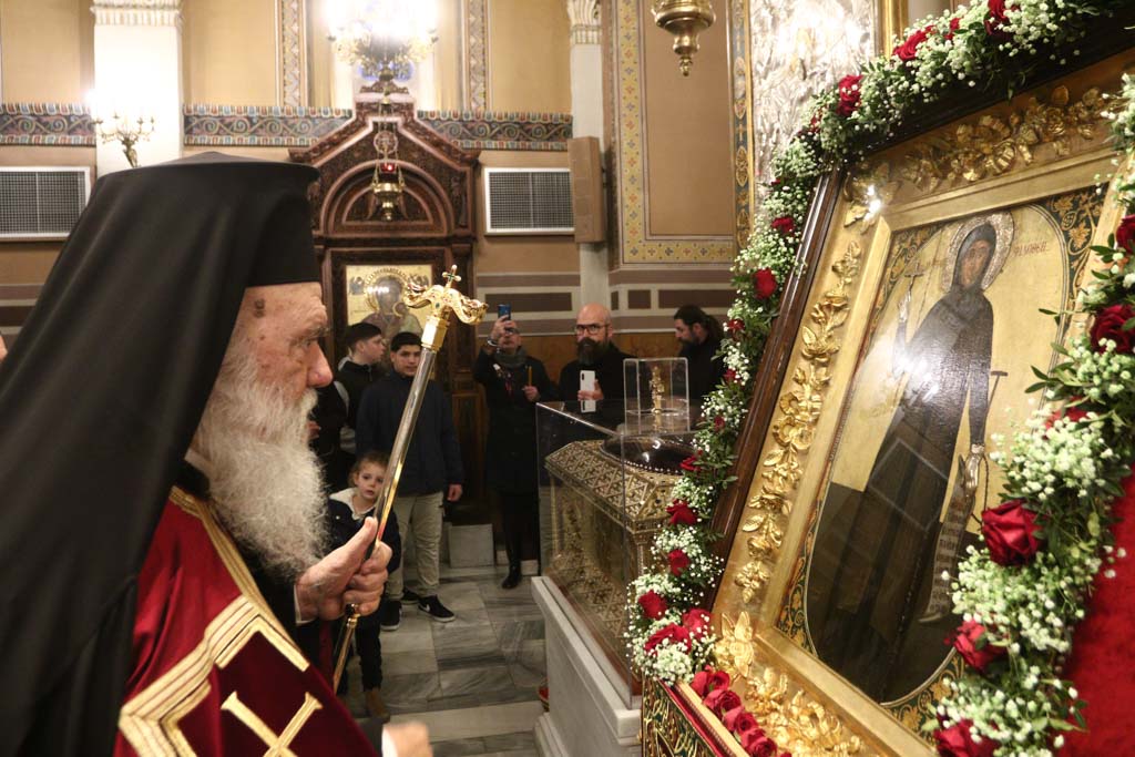 Στη συνέχεια, ακολούθησε η λιτάνευση του ιερού λειψάνου και της ιεράς εικόνος της Αγίας, συνοδεία τιμητικού αγήματος και της φιλαρμονικής του Δήμου Αθηναίων.