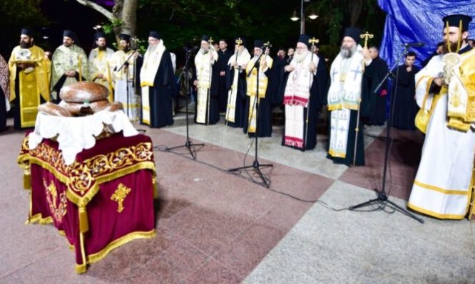 Μετά το τέλος του Εσπερινού, πραγματοποιήθηκε η Λιτανεία των χαριτοβρύτων Λειψάνων του Αγίου μας μέχρι την Κεντρική πλατεία της πόλεως μας, παρουσία των πολιτικών και στρατιωτικών αρχόντων του τόπου μας, καθώς και χιλιάδων Λαρισαίων. Ο σεπτός μας Ποιμενάρχης κ. Ιερώνυμος, δια θερμών λόγων, αμέσως μετά τη δέηση και την ακολουθία της αρτοκλασίας, ευχαρίστησε πρωτίστως, τους Σεβασμιωτάτους Ιεράρχες για την ευλογητή παρουσία τους, ενώ τόνισε την ανάγκη συνολικής και ομαδικής προσπάθειας για την ανόρθωση της Θεσσαλίας με την ευλογία του Αγίου μας και την ενότητα του Λαού μας.