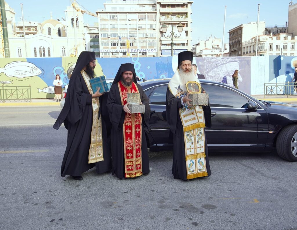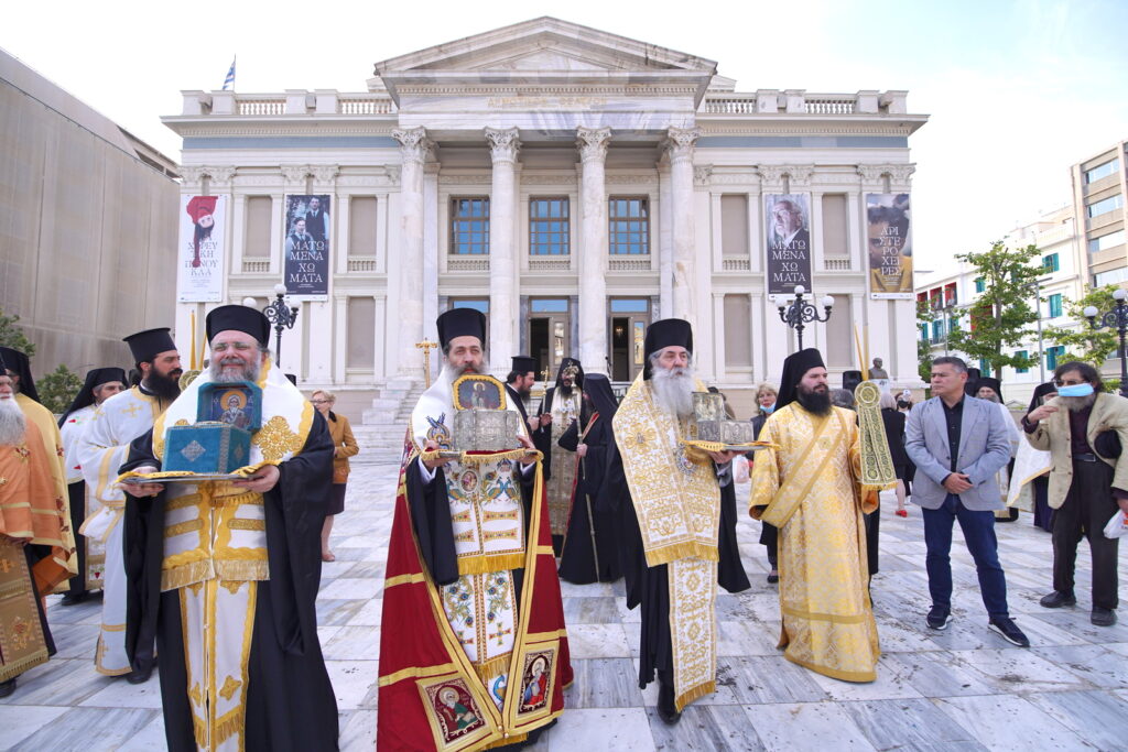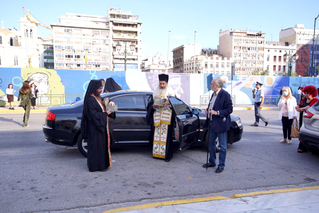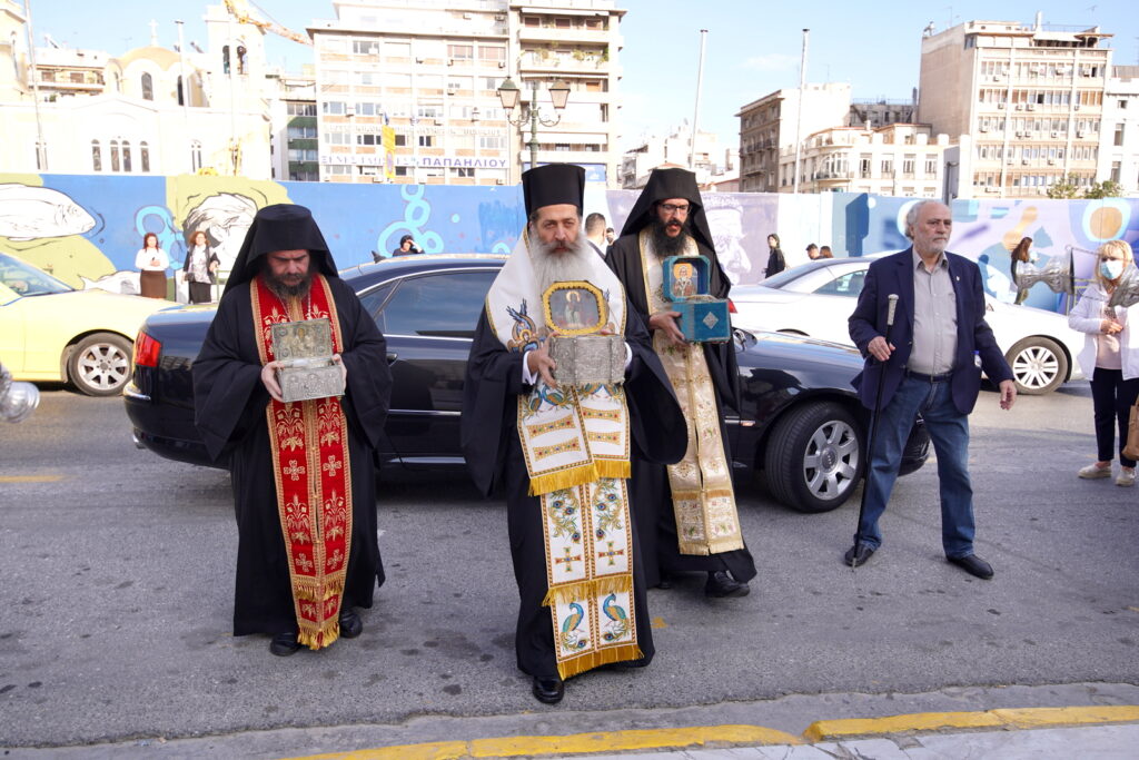 Πιο συγκεκριμένα ο Σεβασμιώτατος Μητροπολίτης Πειραιώς κ.Σεραφείμ, υποδέχθηκε, μπροστά από το Δημοτικό Θέατρο Πειραιά την Τιμία Κάρα του Αγίου Ιωάννου του Νηστευτού, απότμημα της Τιμίας Κάρας του Αγίου Παρθενίου, Επισκόπου Λαμψάκου και την χείρα του Αγίου Ιερομάρτυρος Χαραλάμπους.