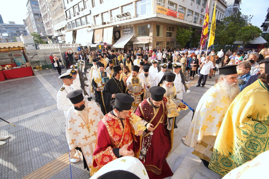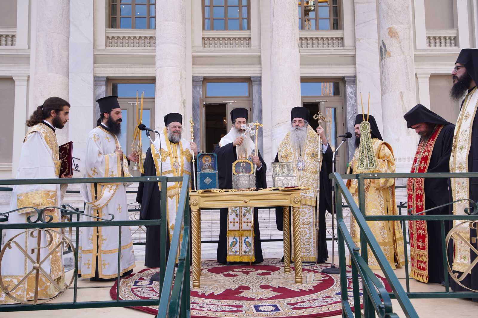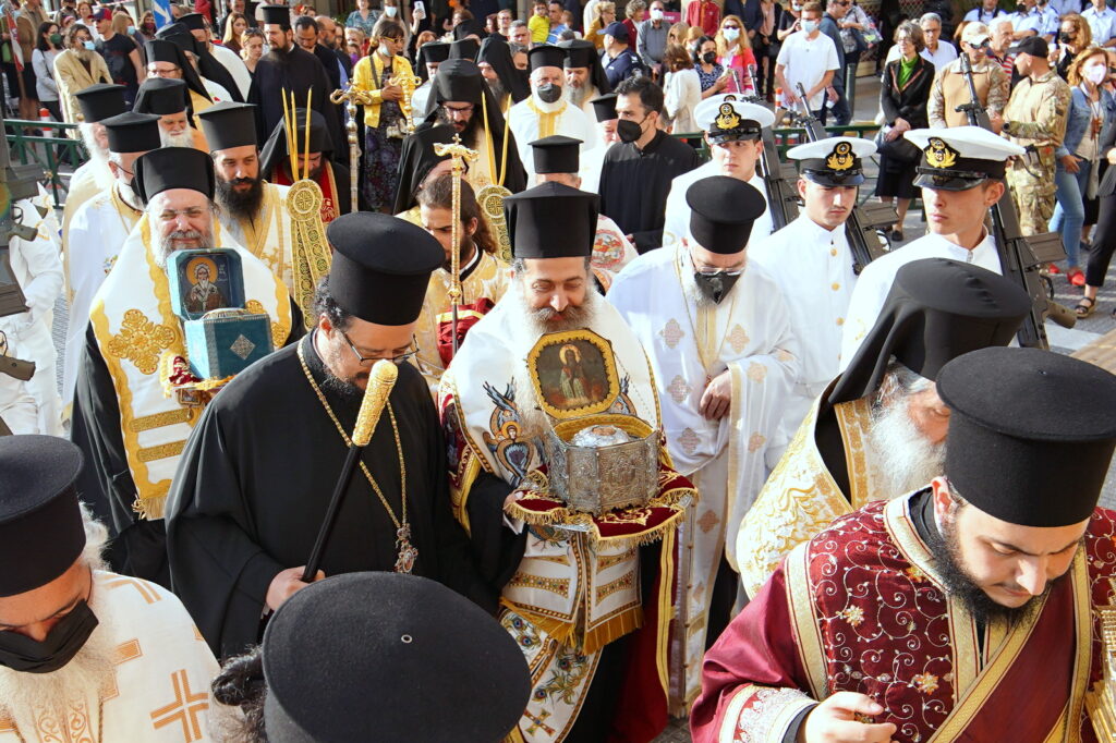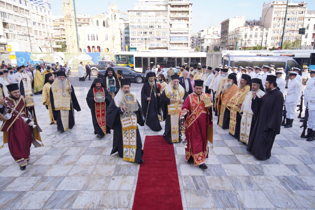 Αφού παιάνισε ο Εθνικός Ύμνος, τα Ιερά Λείψανα μεταφέρθηκαν εν πομπή και τέθηκαν προς προσκύνηση και αγιασμό των πιστών στον Μητροπολιτικό Ιερό Ναό Αγίων Κωνσταντίνου και Ελένης Πειραιώς, όπου τελέστηκε Δοξολογία και εν συνεχεία η Ακολουθία του Εσπερινού, στον οποίο χοροστάτησε και κήρυξε τον Θείο Λόγο ο Σεβασμιώτατος Μητροπολίτης Φθιώτιδος κ.Συμεών, συγχοροστατούντων των Σεβασμιωτάτων Μητροπολίτών Τρίκκης, Γαρδικίου και Πύλης κ.Χρυσοστόμου και Πειραιώς κ.Σεραφείμ.