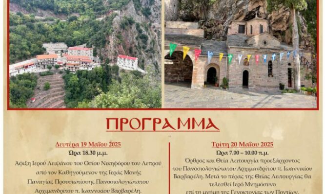 – 7.00 – 10.00 π.μ. Όρθρος και Θεία Λειτουργία ιερουργούντος του Πανοσιολογιωτάτου Αρχιμ. Ιωαννικίου Βαρβαρέλη. Μετά το πέρας της Θείας Λειτουργίας θα τελεσθεί Ιερό Μνημόσυνο επί τη μνήμη της Γενοκτονίας των Ποντίων.