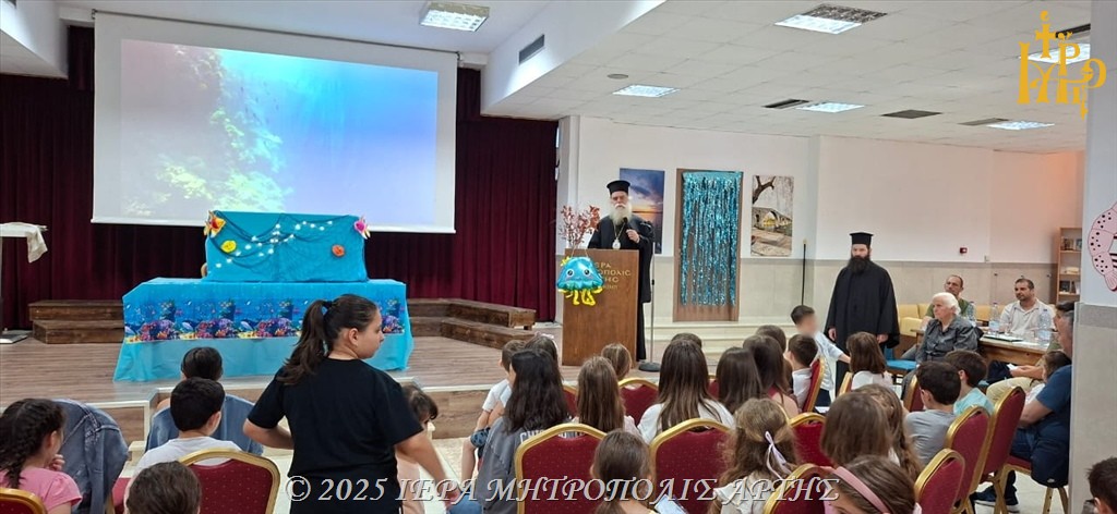 Στην εκδήλωση «Περιπέτεια στον βυθό», παρέστη ο Σεβασμιώτατος Μητροπολίτης Άρτης κ. Καλλίνικος, ο οποίος ευχήθηκε στα παιδιά καλό καλοκαίρι και καλή πρόοδο, προτρέποντάς τα, να πηγαίνουν κάθε Κυριακή στην Εκκλησία με τους οικείους τους και τον ερχόμενο Οκτώβριο, να ξαναέλθουν στις Κατηχητικές Συντροφιές της Τοπικής Εκκλησίας.