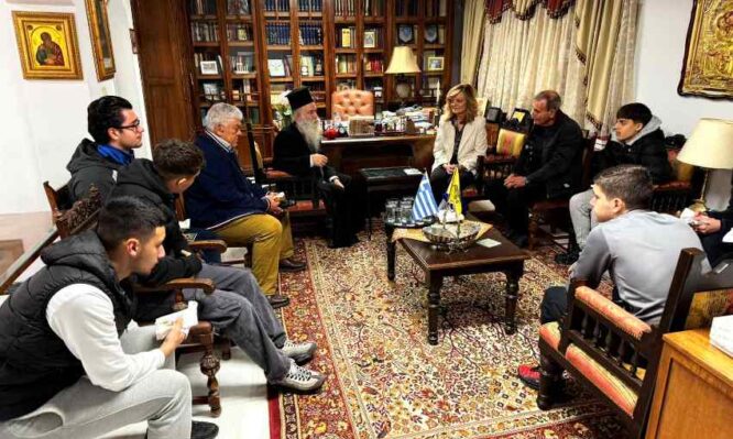 Αντιπροσωπεία μαθητών του 2ου Λυκείου Κορίνθου, συνοδευόμενοι από τη διευθύντρια κα. Λουκία Πολυχρονίου – Κολαΐτη και εκπαιδευτικούς του σχολείου, επισκέφθηκαν σήμερα το πρωί τα Γραφεία της Ι. Μητροπόλεως, αφού πρώτα εκκλησιάστηκαν στο Μητροπολιτικό Παρεκκλήσιο της Αγία Φωτεινής της Σαμαρείτιδος. Σκοπός της επισκέψεως τους ήταν να γνωρίσουν τον νέο Ποιμενάρχη μας κ. Παύλο και να λάβουν την ευχή και την ευλογία Του, για την επικείμενη ιερά αποδημία τους στο Άγιο Όρος.