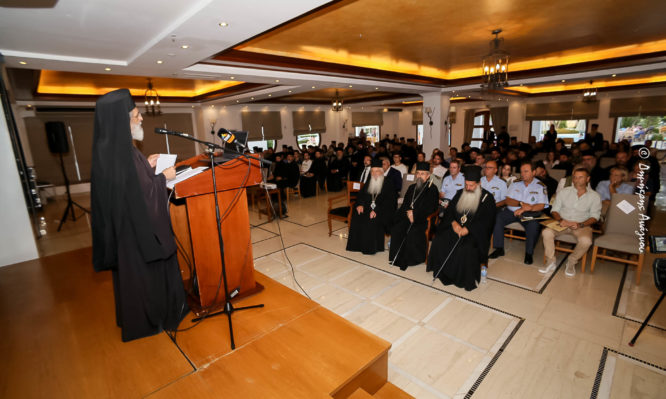 Ο Γραμματεύς της Συνοδικής Επιτροπής, Πανοσιολ. Αρχιμ. π. Πολύκαρπος Μπόγρης παρουσίασε το θέμα του Συνεδρίου ««Η βία ως ανθρωπολογικό πρόγραμμα. Η Ορθόδοξη θεώρηση» ενώ ανέγνωσε το πατρικό μήνυμα του Μακαριωτάτου.