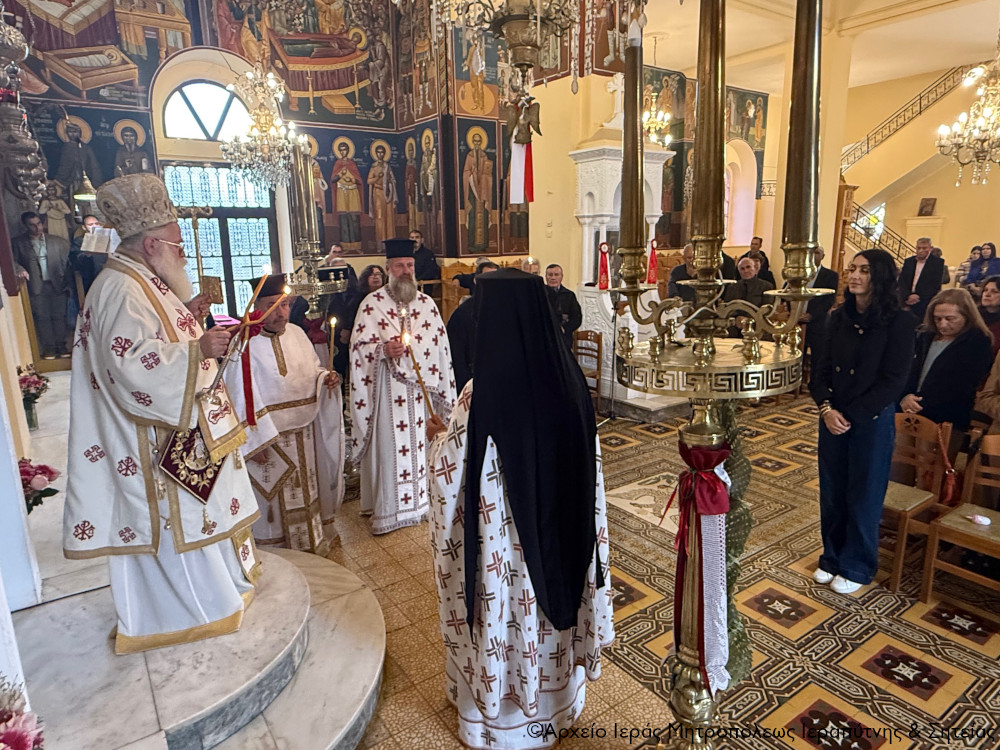 Στην Αρχιερατική Θεία Λειτουργία έλαβαν μέρος ο Πανοσιολ. Αρχιμ. Αμβρόσιος Σκαρβέλης, Πρωτοσύγκελλος της Ι. Μητροπόλεως, ο Αιδεσιμώτατος Οικονόμος π. Παντελεήμων Καββουσανός, Εφημέριος της Ενορίας Κάτω Χωριού, ο Αιδεσιμώτατος Ιερεύς π. Ευάγγελος Γκιάλπης, Εφημέριος της Ενορίας Επισκοπής, και ο Ιερολ. Διάκονος Θεμιστοκλής Μπεϊνάς.