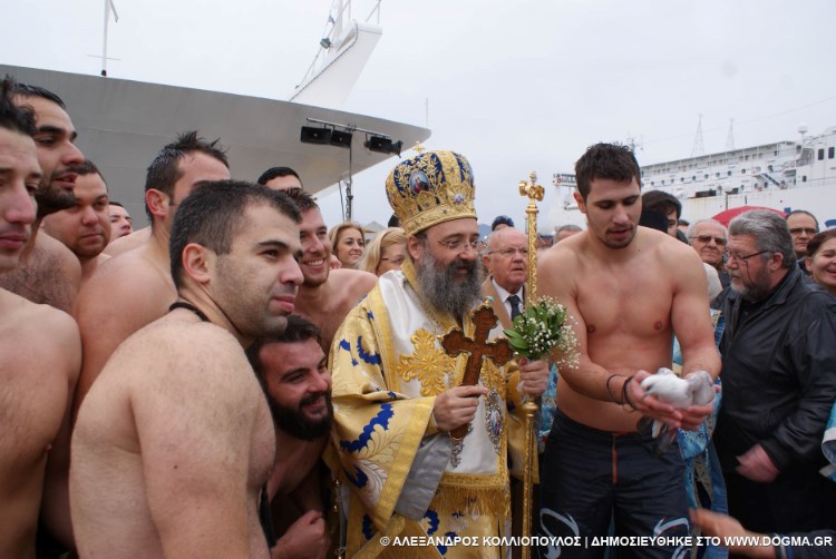 Μετά τον Μεγάλο Αγιασμό στον Ναό, σχηματίσθηκε πομπή, που κατέληξε στο λιμάνι, όπου έγινε η κατάδυση του Τιμίου Σταυρού. Παρά τη βροχή και το ψύχος περί τους σαράντα νέοι έπεσαν στα νερά του Πατραϊκού για να πιάσουν τον Τίμιο Σταυρό.