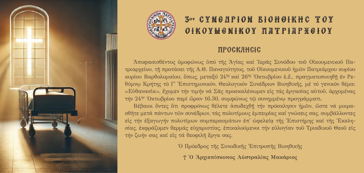 Με θέμα την «Ευθανασία» θα πραγματοποιηθεί, από 24 έως 26 Οκτωβρίου 2025, στο Κέντρο Κοινωνικής και Πολιτισμικής Διακονίας «Θεομήτωρ» της Ιεράς Μητροπόλεως Ρεθύμνης και Αυλοποτάμου, καθώς και στην Ιερά Πατριαρχική και Σταυροπηγιακή Μονή Τιμίου Σταυρού Βωσάκου, στο Μυλοπόταμο, το 3ο Συνέδριο Βιοηθικής του Οικουμενικού Πατριαρχείου.