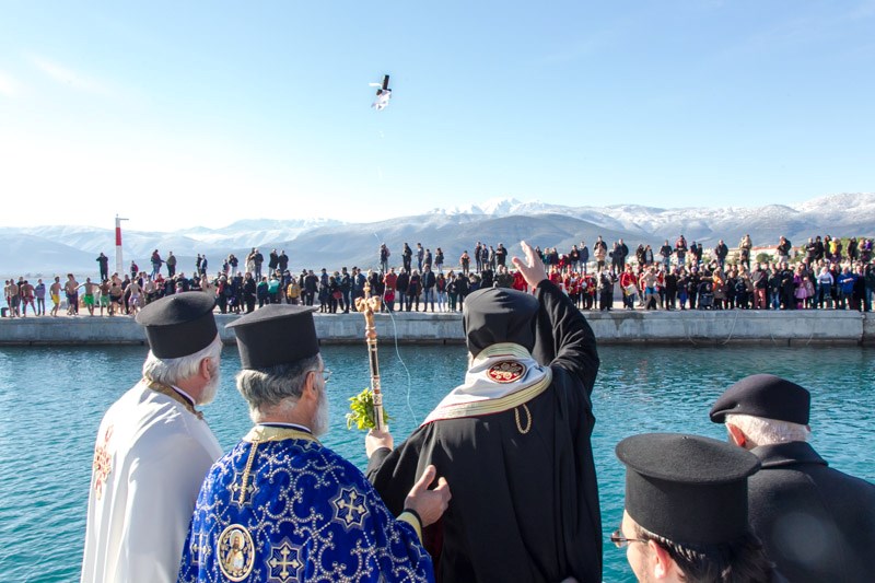 Μετά τό πέρας τῆς θείας λειτουργίας ὁ κ. Αλέξανδρος, πλαισιούμενος ἀπό τόν ἱερό κλῆρο, τόν εὐσεβῆ Λαό καί τούς ἄρχοντες τοῦ τόπου, ἐν πομπῇ μετέβησαν στό λιμάνι τοῦ Παραλίου Ἄστρους, ὅπου ἐκεῖ ἔλαβε χώρα ἡ Ἀκολουθία τοῦ Μεγάλου Ἁγιασμοῦ καί ἐν συνεχείᾳ ὁ μητροπολίτης, ἀκολουθώντας τό ἔθιμο τοῦ καθαγιασμοῦ τῶν ὑδάτων, ἐπιβιβάστηκε σέ καΐκι καί ἔριξε τόν τίμιο Σταυρό στή θάλασσα, εὐλογώντας καί καθαγιάζοντας τά ὕδατα, ἐνῷ παραλλήλως τολμηροί χριστιανοί βούτηξαν στά παγωμένα ὕδατα καί ἀνέσυραν τόν τίμιο Σταυρό, λαμβάνοντας τήν εὐλογία αὐτοῦ.