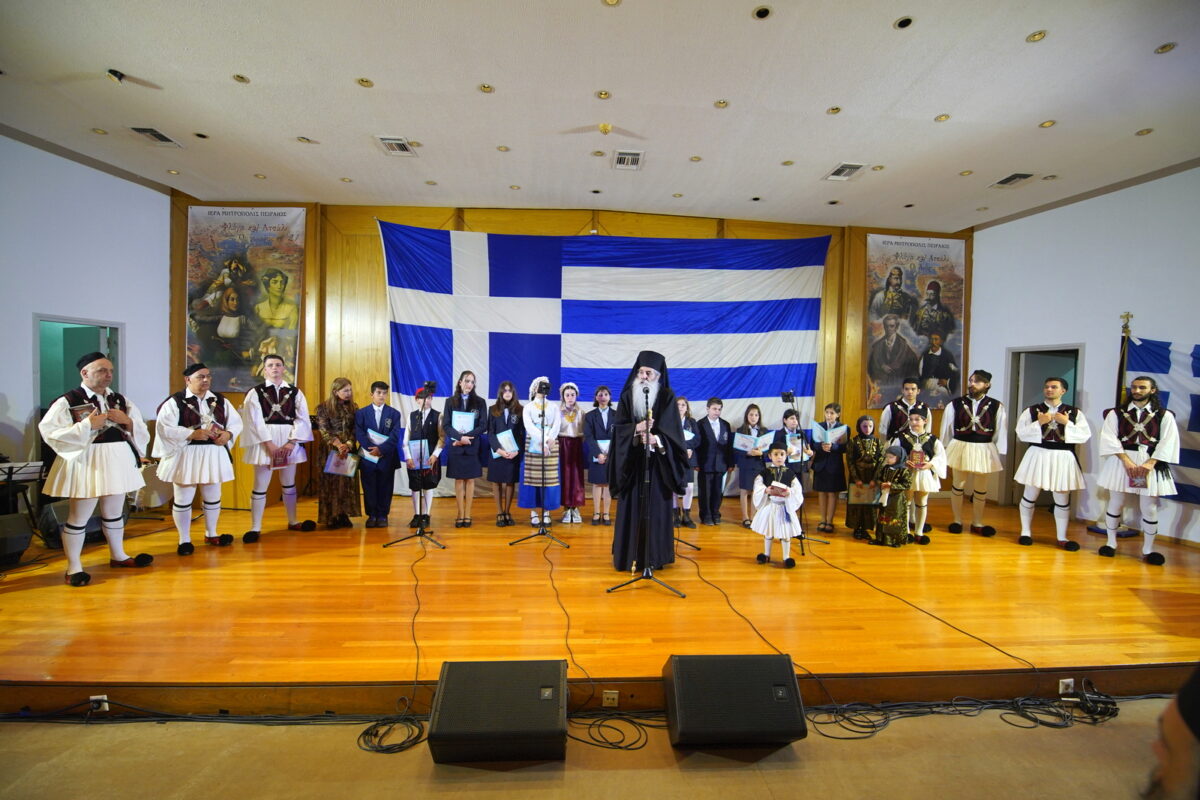 Στο αμφιθέατρο «Αθανάσιος Κανελλόπουλος» του Πανεπιστημίου Πειραιώς, περισσότεροι από 500 νέοι και νέες των Ενοριών της τοπικής μας Εκκλησίας, των Εκπαιδευτηρίων της Ιεράς Μητροπόλεως Πειραιώς, αλλά και Δημοτικών Σχολείων του Πειραιά, παρουσίασαν επετειακά τραγούδια, παραδοσιακούς χορούς και δρώμενα, ενώ η θεατρική ομάδα της Μητροπόλεώς μας παρουσίασε το μονόπρακτο με τίτλο «Το όνειρο της Ψωροκώσταινας» σε συγγραφή και σκηνοθεσία του καθηγητή Χρήστου Παναγιώτου.