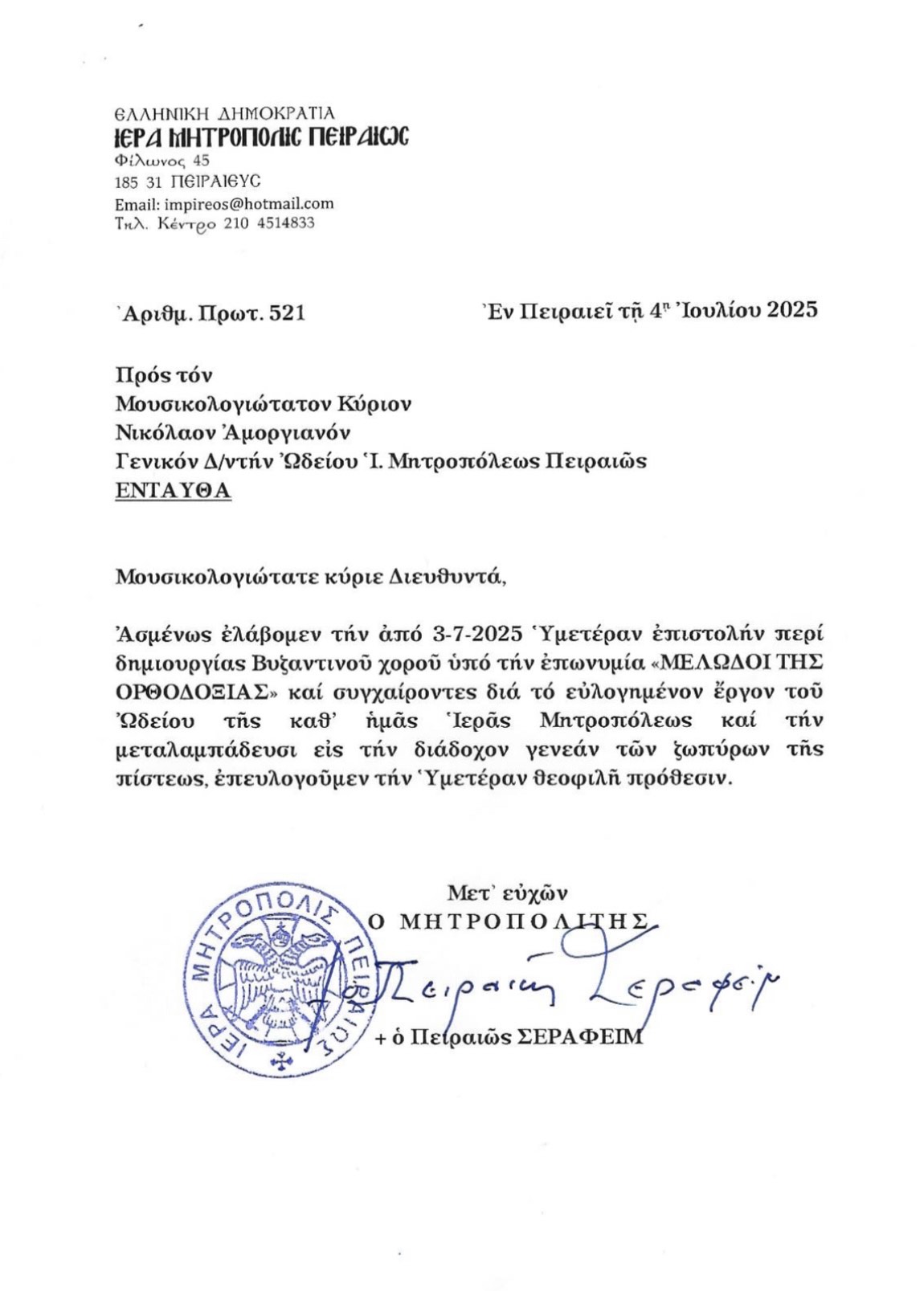 Με τις ευχές και ευλογίες Του Σεβασμιωτάτου Μητροπολίτου Πειραιώς κ.κ. Σεραφείμ, συστήνεται Βυζαντινός Μουσικός Χορός με τίτλο «ΜΕΛΩΔΟΙ ΤΗΣ ΟΡΘΟΔΟΞΙΑΣ» που θα απαρτίζεται από εν ενεργεία σπουδαστές και αποφοίτους του Ωδείου της Ιεράς Μητροπόλεως Πειραιώς.