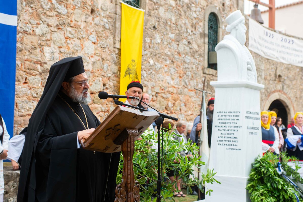 Ακολούθως έλαβε τον λόγο ο οικοδεσπότης της εκδήλωσης, Σεβ. Μητροπολίτης Μεσσηνίας κ. Χρυσόστομος, οποίος αφού ευχαρίστησε τους παρόντες εκπροσώπους των τοπικών Αρχών, τον Γεν. Γραμματέα του Υπουργείου Εξωτερικών κ. Δημ. Σκάλκο, τους Βουλευτές του Νομού Μεσσηνίας κ. Μίλτο Χρυσομάλλη και κ. Περικλή Μαντά, τον Περιφερειάρχη Πελοποννήσου κ. Δημ. Πτωχό, τον Δήμαρχο Καλαμάτας κ. Αθ. Βσιλόπουλο, τους Αντιπεριφερειάρχες, τα Μέλη του Δημ. Συμβουλίου Καλαμάτας, τον Αστυνομικό Διευθυντή, τον Διοικητή της Πυροσβεστικής Ν. Μεσσηνίας, τον Ελλογιμώτατο Καθηγητή και Ομιλητή, τον Αρχιμ. Χριστοφόρο Νταμάτη και τους λαϊκούς συνεργάτες του, τον δωρητή της προτομής κ. Παν. Λαδά και τον εκ Θεσσαλονίκης δωρητή της Πινακοθήκης του Αγώνα κ. Δημ. Καραπουλουτίδη, τα εγκαίνια της οποίας πραγματοποιήθηκαν ως κατακλείδα των εκδηλώσεων, αναφέρθηκε στο πρόσωπο του Παπαφλέσσα τονίζοντας χαρακτηριστικά ότι “Ο Παπαφλέσσας ήταν πραγματικός Πατριώτης. Δεν ήταν Εθνικιστής, όπως θέλουν μερικοί να τον αναφέρουν. Αγωνίσθηκε για την Ελευθερία της Πατρίδας του και δεν διεκδίκησε τίποτα για τον εαυτό του και αυτοί είναι οι πραγματικοί Πατριώτες. Ούτε αυτοί που πιστεύουν ότι με τα “ήρεμα νερά” θα μπορέσουμε να λύσουμε τα προβλήματά μας, ούτε αυτοί οι οποίοι επενδύουν σε δημόσιες σχέσεις”.