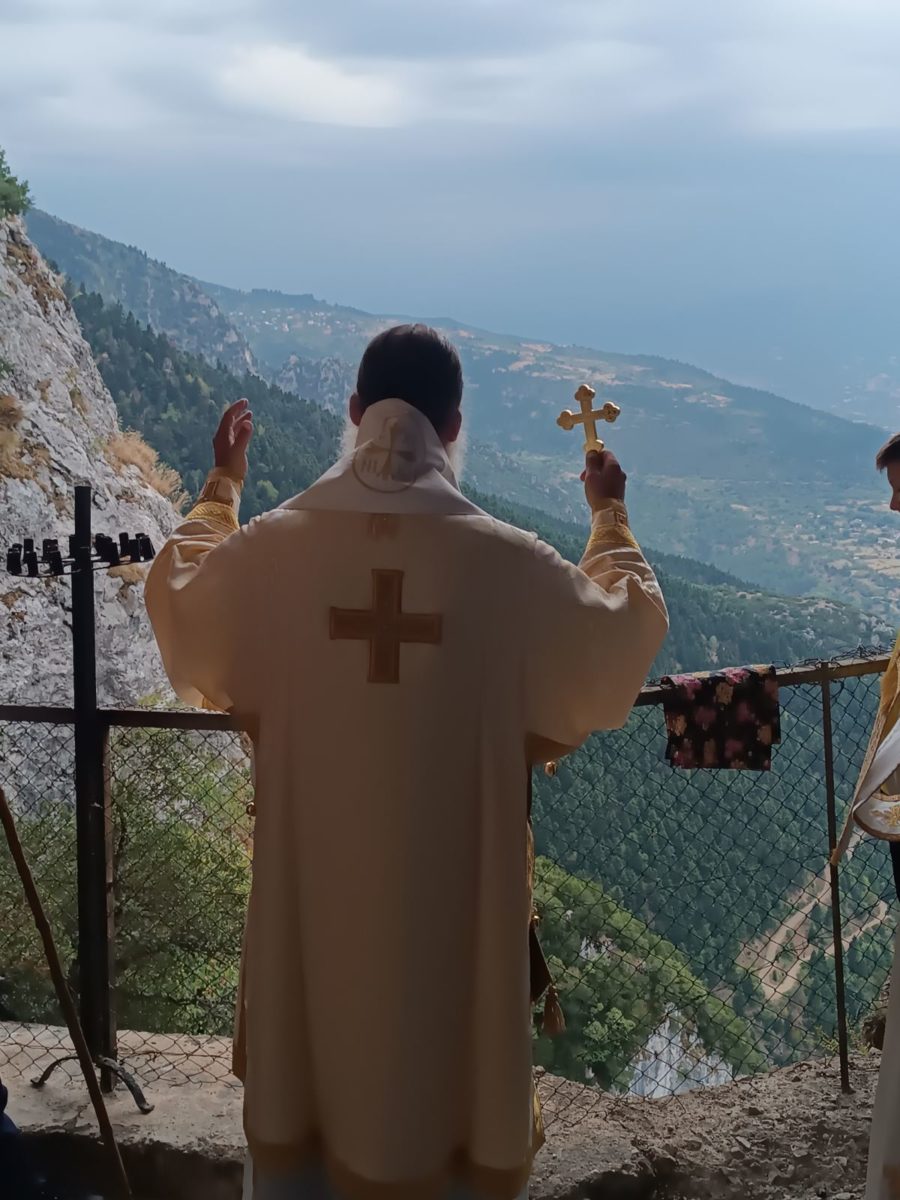 Ο Σεβασμιώτατος κ. Συμεών, λίαν πρωί μαζί με την ομάδα των νέων από την θέση Περιβόλια στην Υπάτη ξεκίνησε την ανάβαση για το σπήλαιο της Αγίας, όπου μετά από δυόμισι περίπου ώρες φθάνοντας με πολύ συγκίνηση προσκύνησε την Ιερά Εικόνα της Αγίας και ετέλεσε Αρχιερατική Θεία Λειτουργία στον σπηλαιώδη Ναό, με την μοναδική θέα.