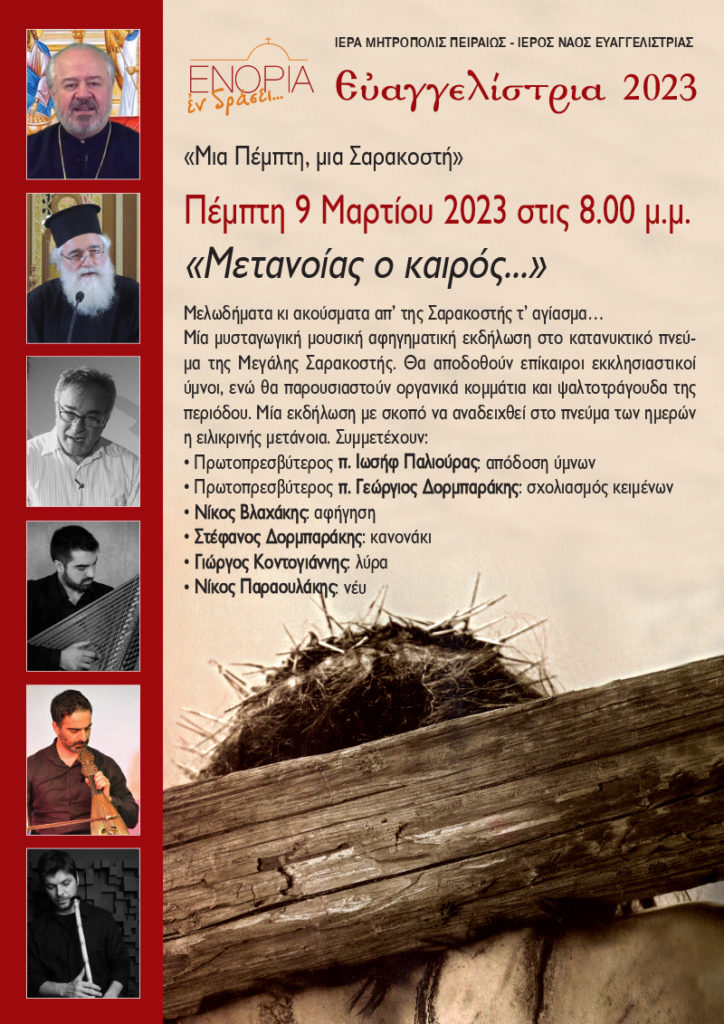 Την Πέμπτη 9 Μαρτίου 2023 στις 8.00 μ.μ. στη σειρά των εκδηλώσεων «Μια Πέμπτη, μια Σαρακοστή», στον Ιερό Ναό Ευαγγελιστρίας Πειραιώς, θα ακουστούν Μελωδήματα κι ακούσματα απ’ της Σαρακοστής τ’ αγίασμα…