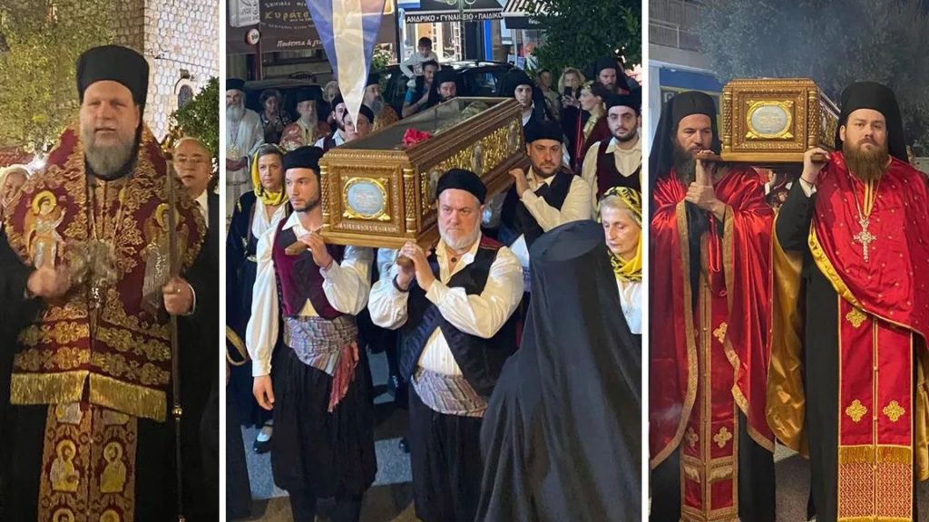 Στη συνέχεια, εψάλη Ιερά Παράκληση προς τον Άγιο Γεώργιο τον Νεαπολίτη και πραγματοποιήθηκε προσκύνηση του Ιερού Λειψάνου του και διανομή των ιερών αμφίων του προς ευλογία του πιστού λαού.