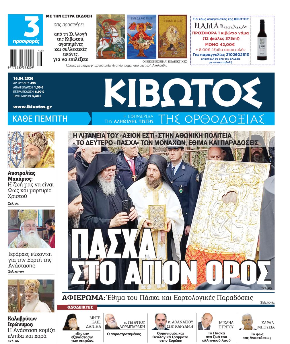Για παλαιότερα βιβλία και εικόνες που κυκλοφόρησαν με το φύλλο της Κιβωτού, πληροφορίες και παραγγελίες, επικοινωνήστε στο τηλ. 210 6923211, books@ikivotos.gr Καθημερινά, εκτός Σ/Κ από 10:00π.μ. έως 15:00μ.μ.