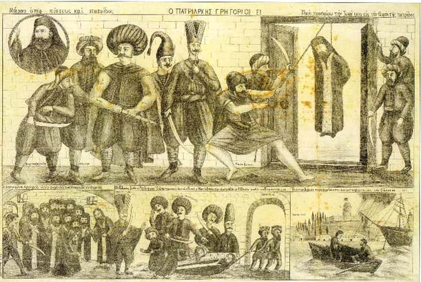 Το απόγευμα της 10ης Απριλίου 1821, οι Τούρκοι κρέμασαν στην κεντρική Πύλη του Πατριαρχείου τον Οικουμενικό Πατριάρχη Γρηγόριο Ε’, τον οποίο η αγία μας Εκκλησία κατέταξε ως μάρτυρα μεταξύ των αγίων και τιμά τη μνήμη του την ίδια ημέρα, ημέρα του μαρτυρίου του.