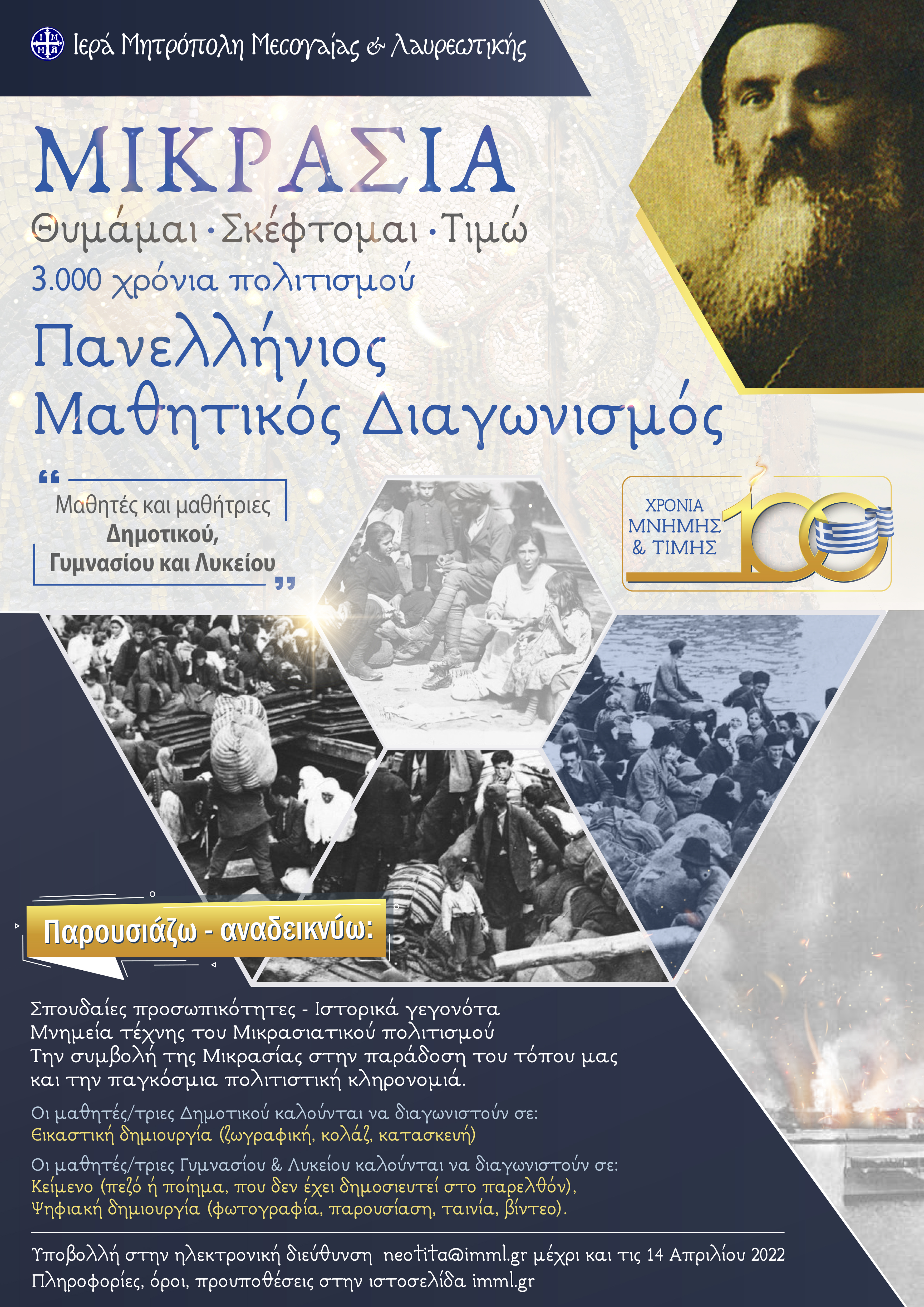 Στο πλαίσιο των εκδηλώσεων μνήμης για τα 100 χρόνια από την Μικρασιατική καταστροφή, τo Γραφείο Νεότητος της Μητρόπολης Λαυρεωτικής διοργανώνει Πανελλήνιο Μαθητικό Διαγωνισμό γραπτού λόγου, εικαστικής και ψηφιακής δημιουργίας κατά το τρέχον σχολικό έτος με θέμα:«Μικρασία: γνωρίζω, σκέφτομαι, τιμώ 3.000 χρόνια πολιτισμού»