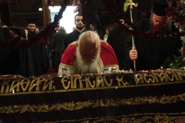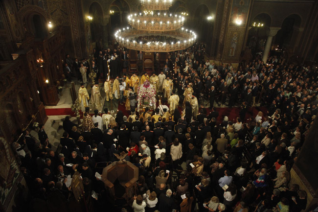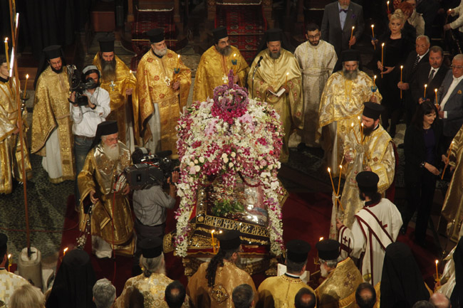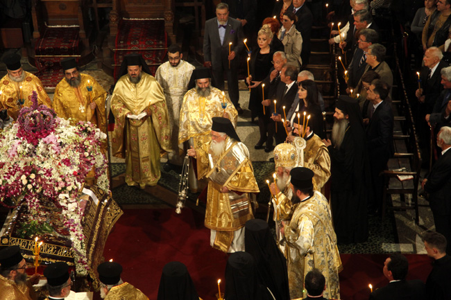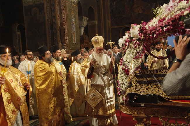 Ο Αρχιεπίσκοπος τέλεσε την ακολουθία του Επιταφίου στον Ιερό Ναό Αγίου Διονυσίου Αρεοπαγίτου και συγχοροστάτησαν οι Επίσκοποι Φαναρίου κ. Αγαθάγγελος και Ναζιανζού κ. Θεοδώρητος. Παρέστησαν η αναπληρώτρια υπουργός Τουρισμού κ. Έλενα Κουντουρά, ο Υφυπουργός Εξωτερικών κ. Γιάννης Αμανατίδης, ο πρόεδρος της Ένωσης Κεντρώων κ. Βασίλης Λεβέντης, πολιτικοί, αξιωματικοί της Ελληνικής Αστυνομίας, της Πυροσβεστικής, των Σωμάτων Ασφαλείας, εκπρόσωποι της Περιφέρειας, της Τοπικής Αυτοδιοίκησης, του Ερυθρού Σταυρού, κληρικοί και εκατοντάδες πιστοί.