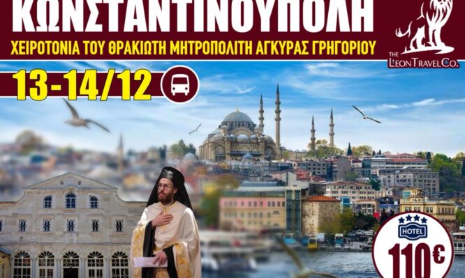 Την Κυριακή 14 Δεκεμβρίου 2025, στον Πάνσεπτο Πατριαρχικό Ναό του Αγίου Γεωργίου στο Φανάρι Κωσταντινούπολης, θα τελεσθεί η χειροτονία σε επίσκοπο του συμπατριώτη μας εψηφισμένου Μητροπολίτου Αγκύρας κ. Γρηγορίου. Πληροφορούμεθα ότι το τουριστικό γραφείο “The Leon travel co” διοργανώνει εκδρομή στην Κωνσταντινούπολη με αφορμή την χειροτονία, το διήμερο Σάββατο και Κυριακή 13 και 14 Δεκεμβρίου, […]