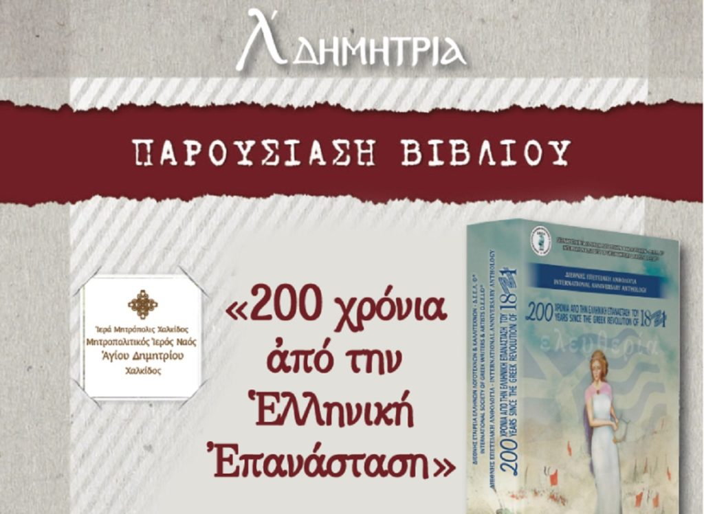 Στο πλαίσιο των φετινών εορταστικών εκδηλώσεων των «Λ´ Δημητρίων», που διοργανώνει εδώ και τριάντα συνεχή έτη ο Μητροπολιτικός Ιερός Ναός Αγίου Δημητρίου Χαλκίδος, την Πέμπτη 20 Οκτωβρίου 2022 και ώρα 6:30 το απόγευμα θα πραγματοποιηθεί εκδήλωση – παρουσίαση του τόμου της Διεθνούς Επετειακής Ανθολογίας για τα 200 χρόνια από την Ελληνική Επανάσταση.